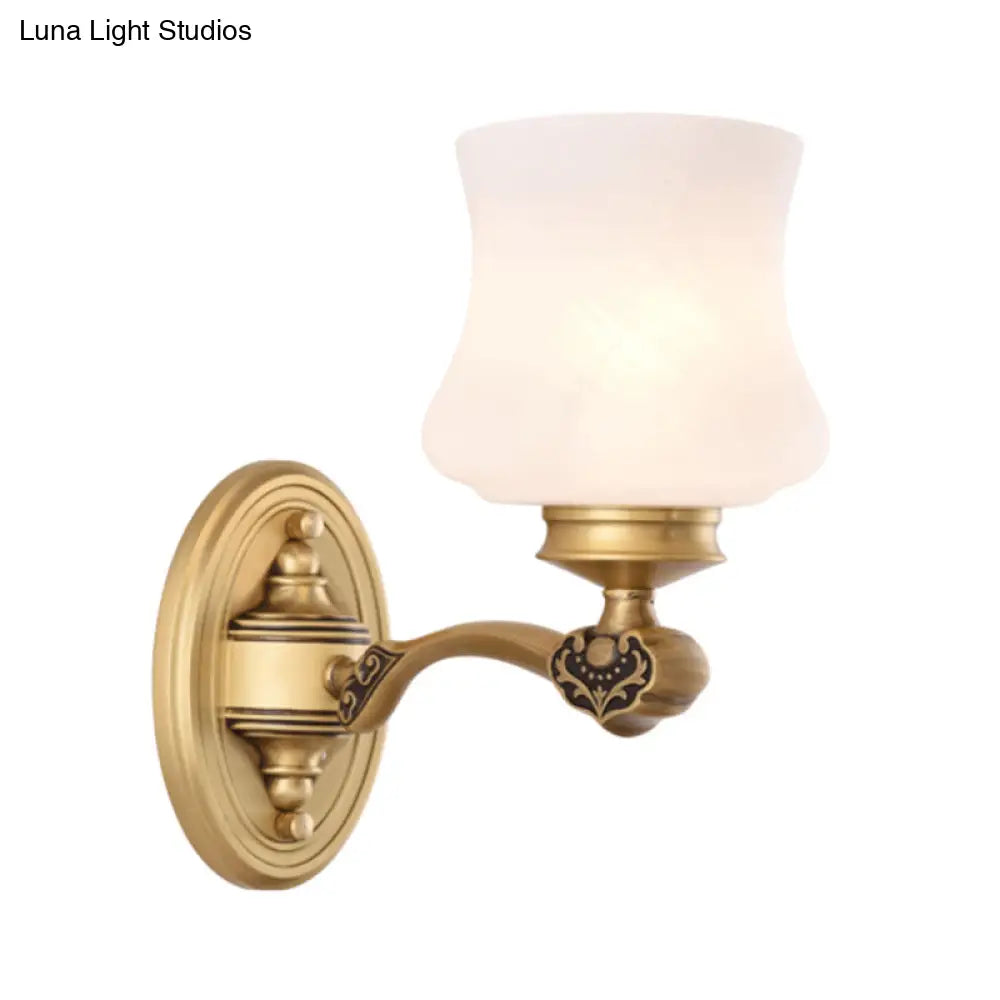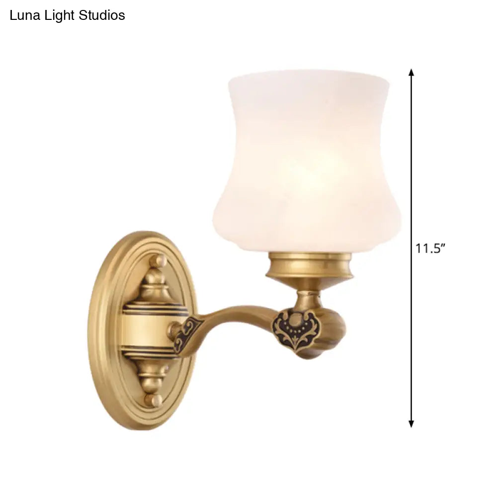 مصباح جداري من الزجاج الحليبي على شكل جرة ريفية بلمسة نهائية من النحاس - فكرة إضاءة غرفة النوم