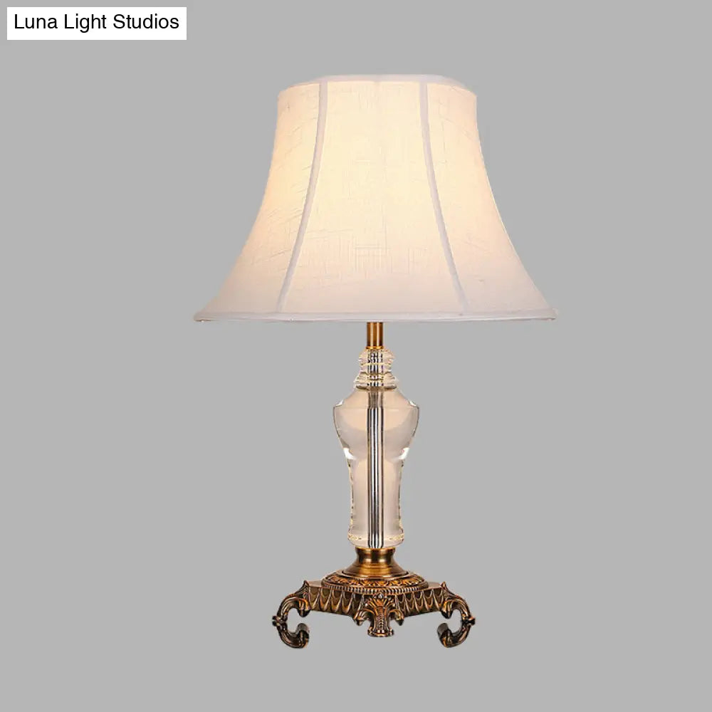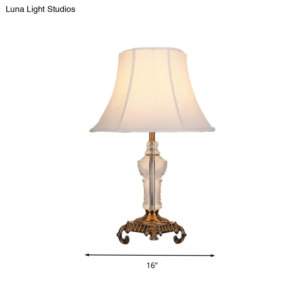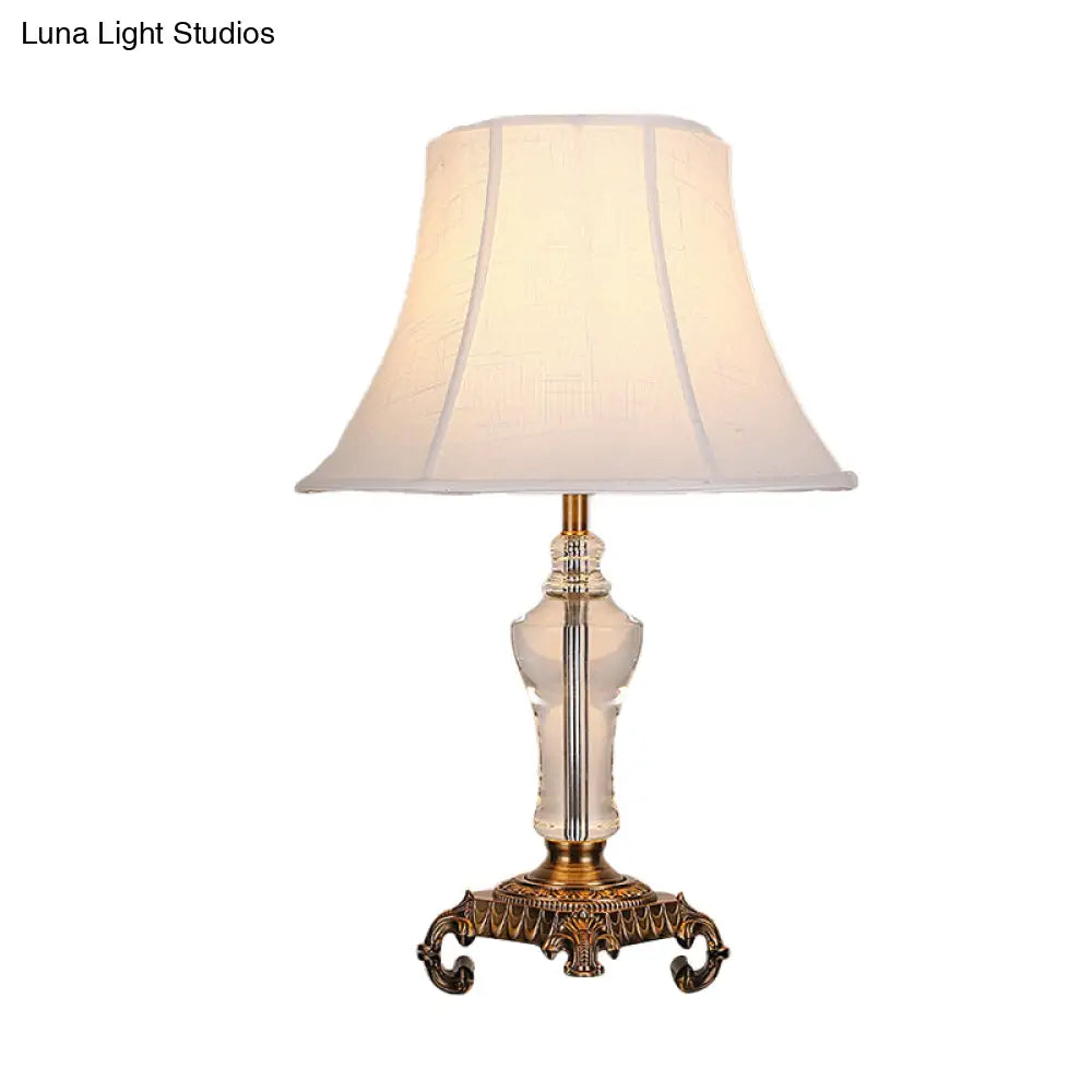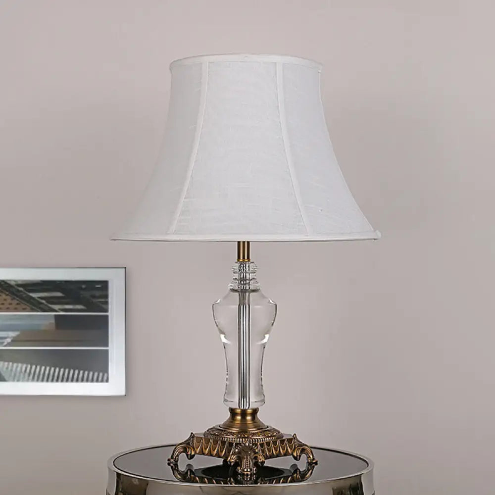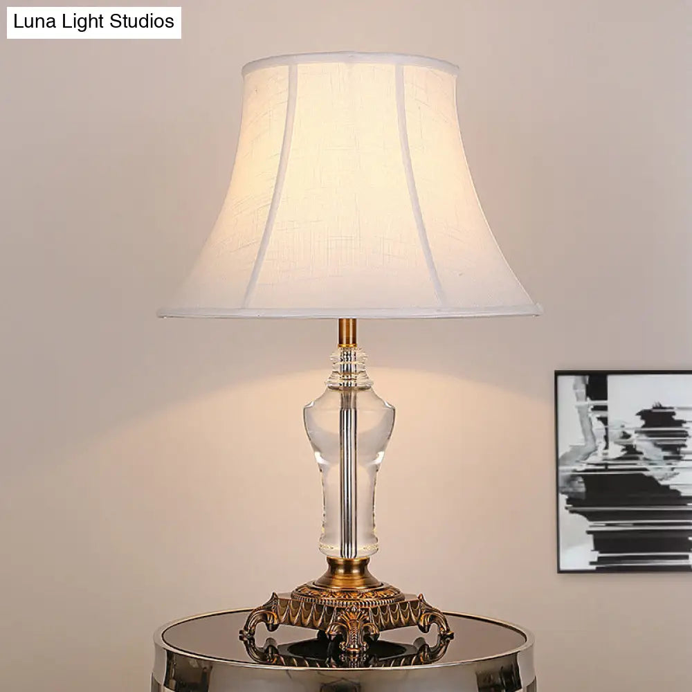 مصباح طاولة ليلية مخروطي أبيض ريفي مع لمسة من الكريستال - غطاء من القماش، ضوء واحد - مثالي لغرفة المعيشة