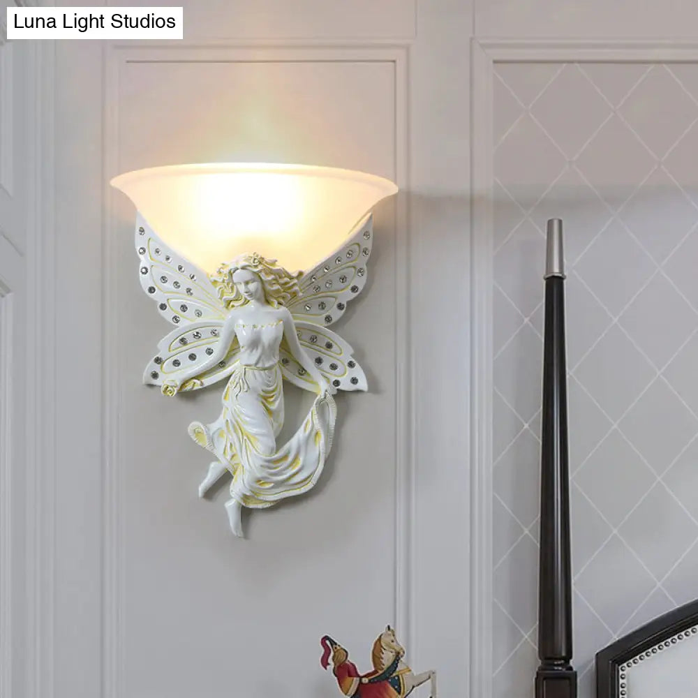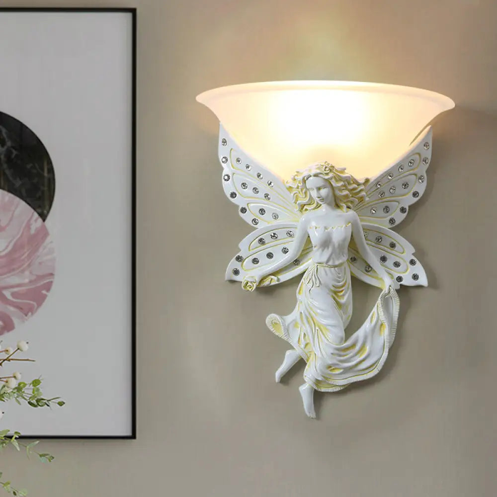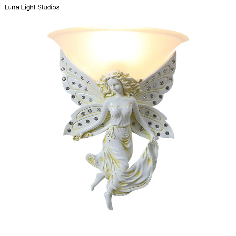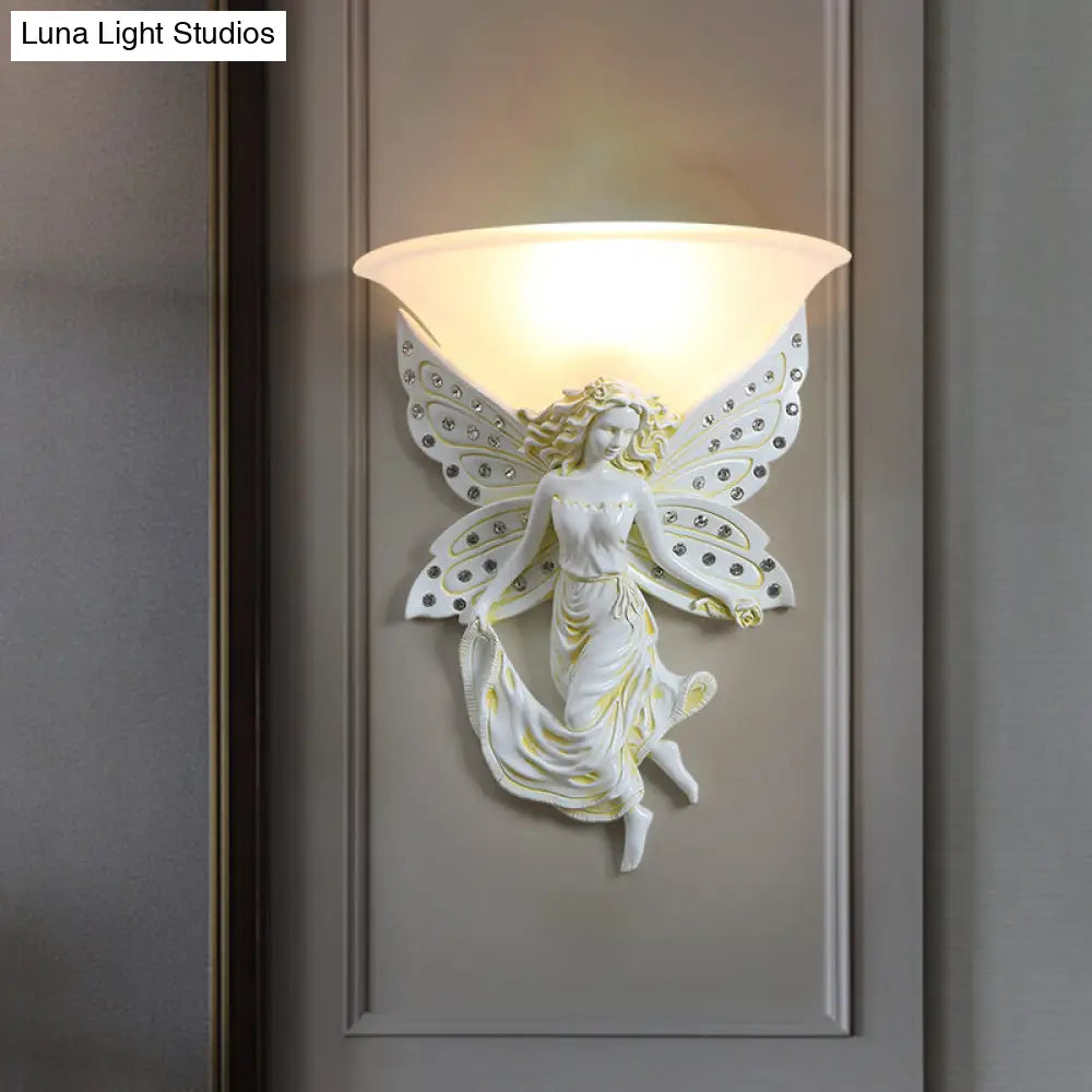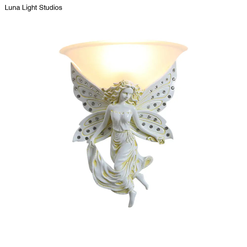 شمعدان جداري من الزجاج الأوبال بنصف وعاء مع ملاك من الراتنج - أبيض/ذهبي