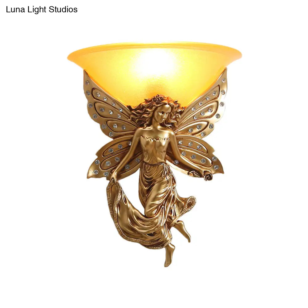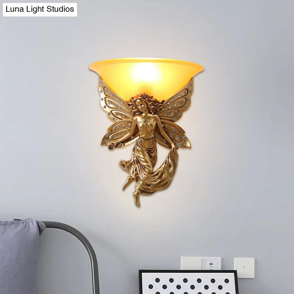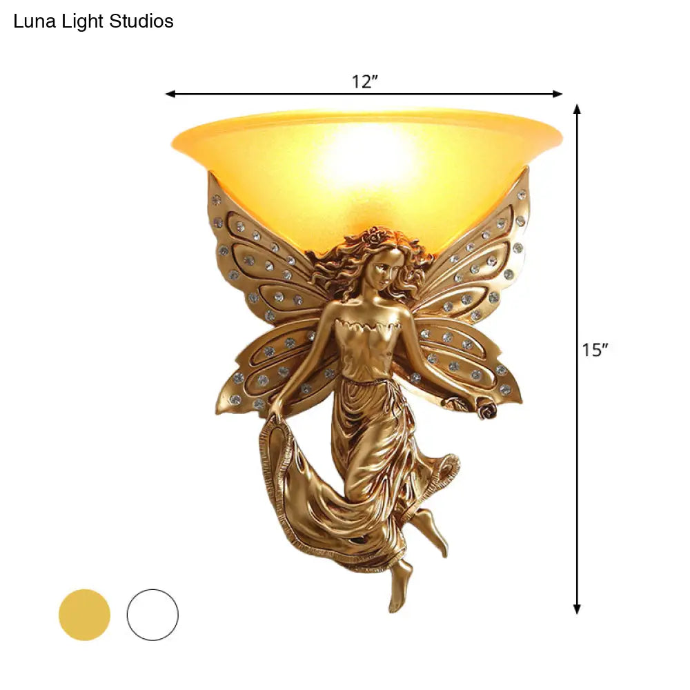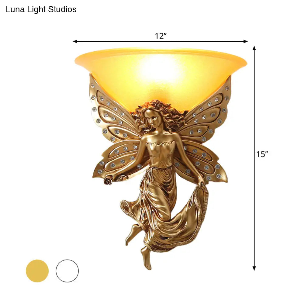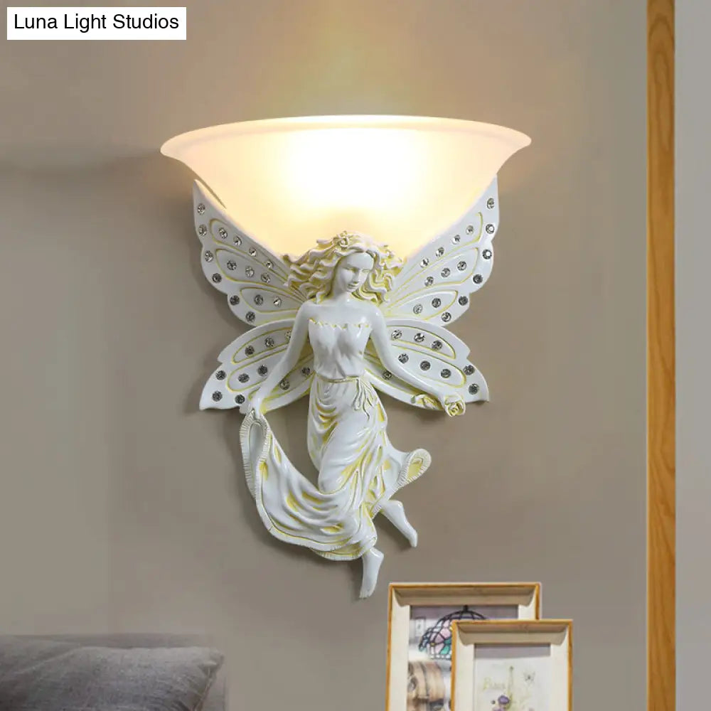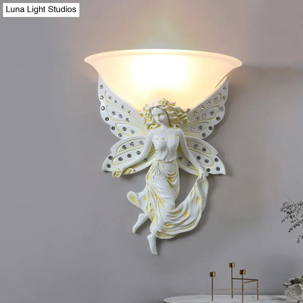 شمعدان جداري من الزجاج الأوبال بنصف وعاء مع ملاك من الراتنج - أبيض/ذهبي