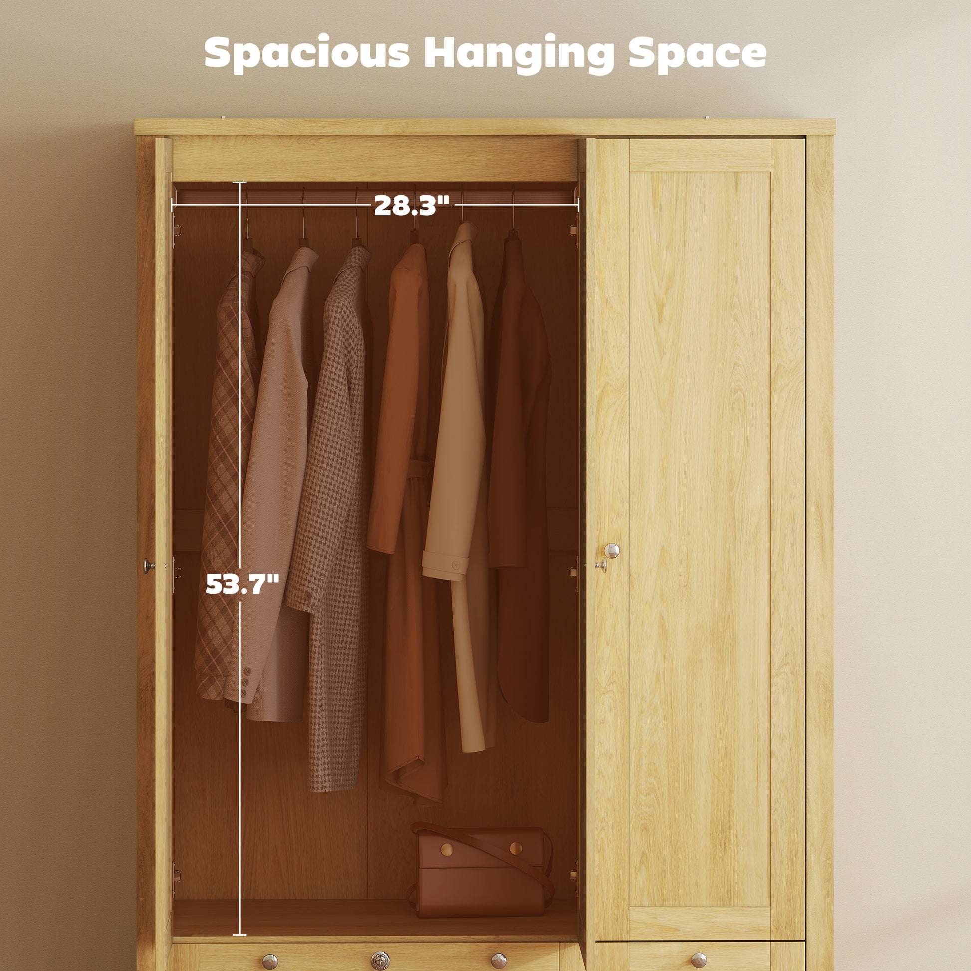 Tired of cluttered closets? This armoire wardrobe closet offers large storage with a spacious hanging area for coats and dresses, three shelves for folded clothes, and two deep drawers for everyday essentials. A lockable drawer keeps personal items secure, while the modern bedroom armoire with shaker-style doors and silver knobs blends into any room. Features: - Spacious hanging space for coats, dresses, or suits - Three enclosed shelves store folded clothes with ease - Two deep bottom drawers for socks, underwear, or small items - 1.2" thick top provides a reliable surface for out-of-season clothing or beddings - The large drawer is lockable with two keys to keep personal belongings secure - Particleboard and MDF blend holds up to 165 lbs. - Anti-tipping straps add safety in daily use - Assembly required Specification: - Color: Natural - Materials: Particleboard, MDF - Overall Dimensions: 47.2" W x 18.7" D x 68.5" H - Hanging Space Size: 28.3" W x 17.7" D x 53.7" H - Each Shelf Size: 14.2" W x 15.7" D x 17.5" H - Drawer Inner Size: 26.1" W x 11.1" D x 4.3" H (large), 12" W x 11.1" D x 4.3" H (small) - Bottom Clearance: 5.5" - Weight Capacity: 165 lbs. (total), 44 lbs. (top), 33 lbs. (hanging rod), 22 lbs. (shelf), 11 lbs. (drawer) - Item Label: 83D-057V80ND Package Includes: - 1 x Armoire Wardrobe Closet - 2 x Key - 1 x Manual Tired of cluttered closets? - Anti-tipping straps add safety in daily use - Assembly required Specification: - Color: White, Teak - Materials: Particleboard, MDF - Overall Dimensions: 47.2" W x 18.7" D x 68.5" H - Hanging Space Size: 28.3" W x 17.7" D x 53.7" H - Each Shelf Size: 14.2" W x 15.7" D x 17.5" H - Drawer Inner Size: 26.1" W x 11.1" D x 4.3" H (large), 12" W x 11.1" D x 4.3" H (small) - Bottom Clearance: 5.5" - Weight Capacity: 165 lbs. (drawer) - Item Label: 83D-057V80WT Package Includes: - 1 x Armoire Wardrobe Closet - 2 x Key - 1 x Manual.