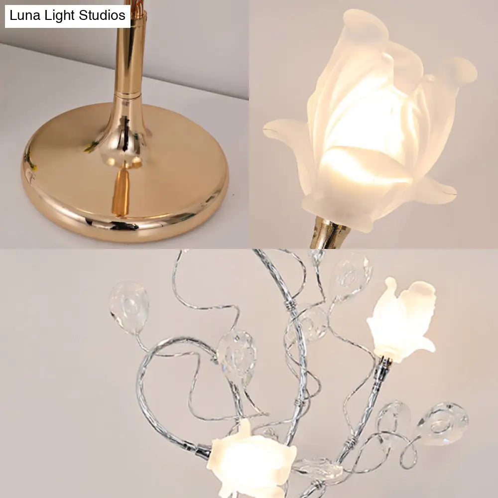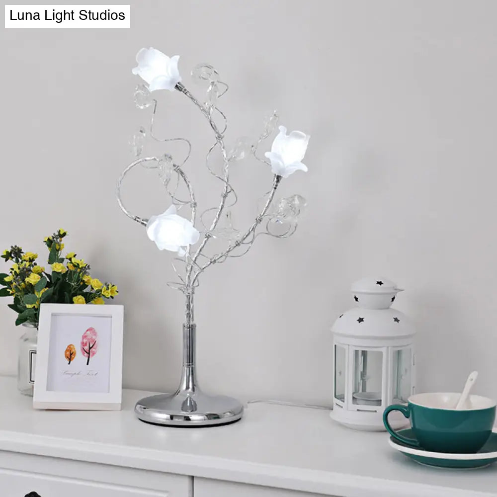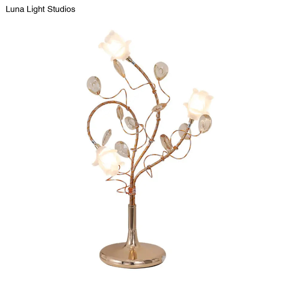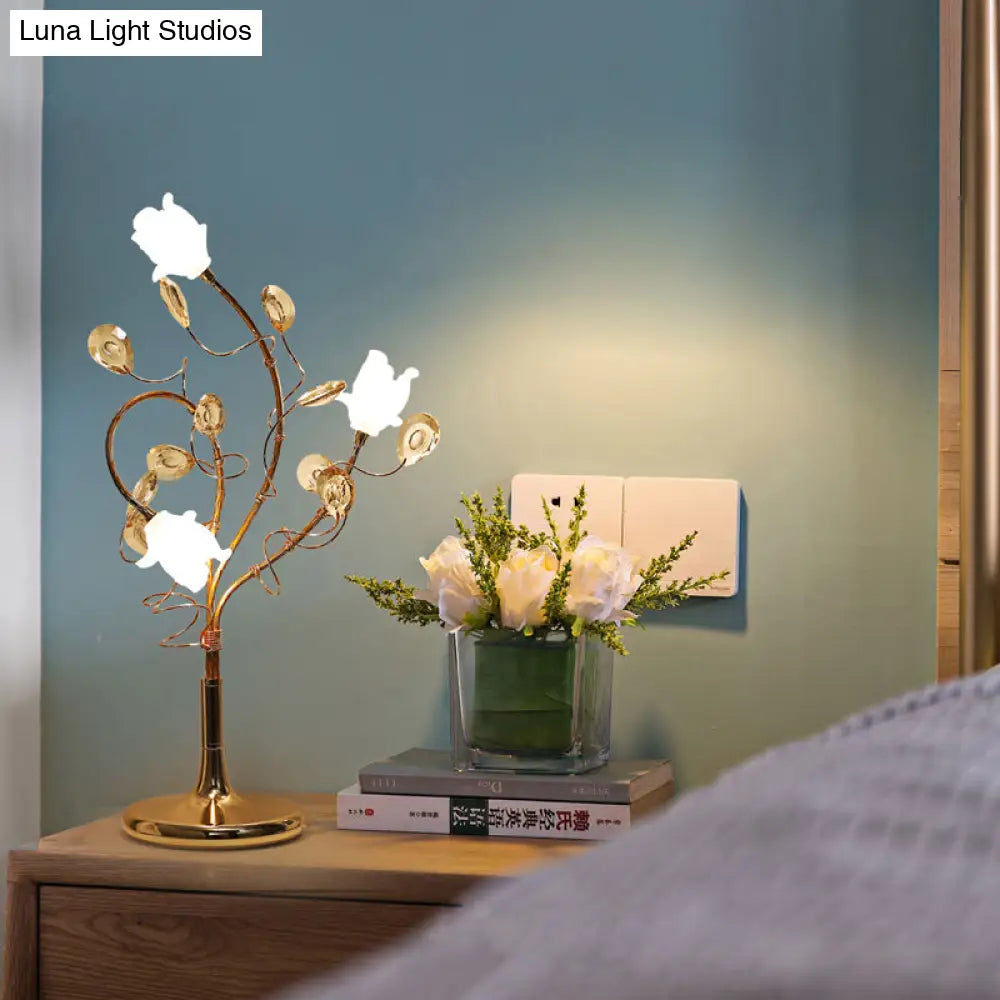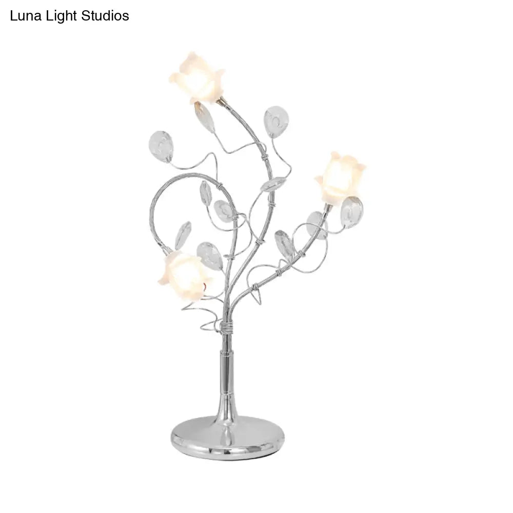 مصابيح طاولة جانبية ريفية فضية/ذهبية بثلاثة رؤوس، وغطاء زجاجي أبيض، وديكور من الكريستال