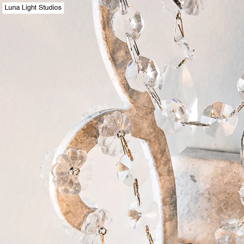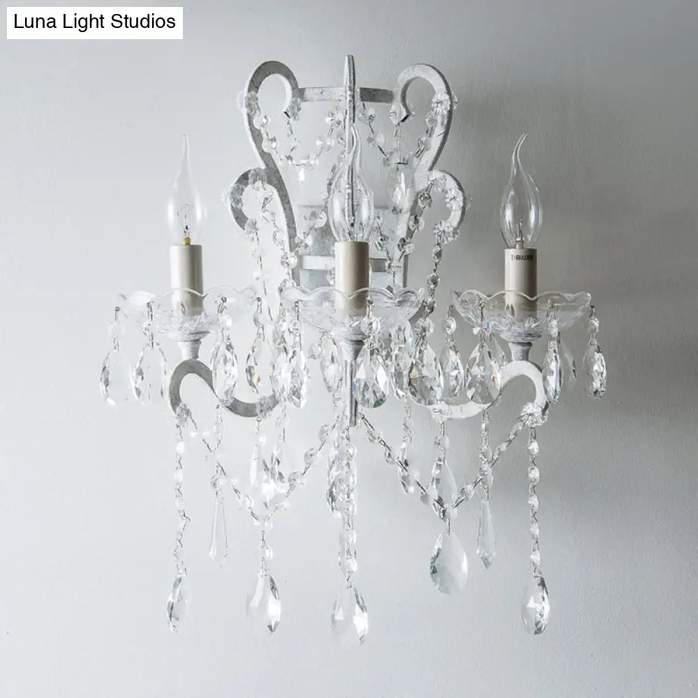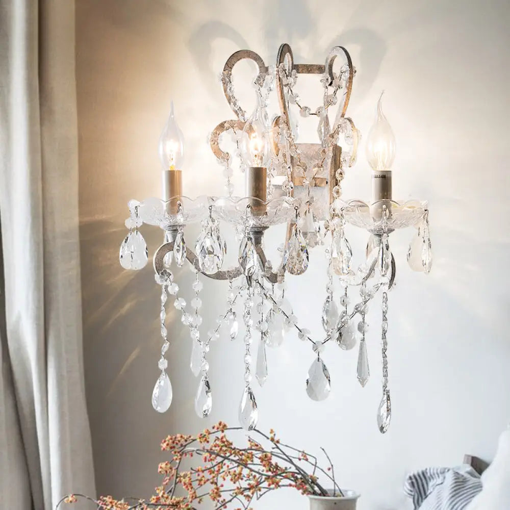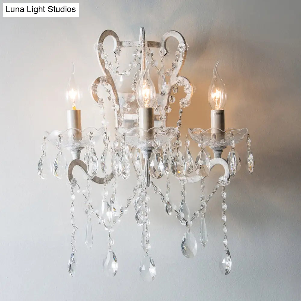 مصباح حائط شمعدان عتيق بلمسة كريستالية - تركيب معدني أبيض بثلاثة رؤوس