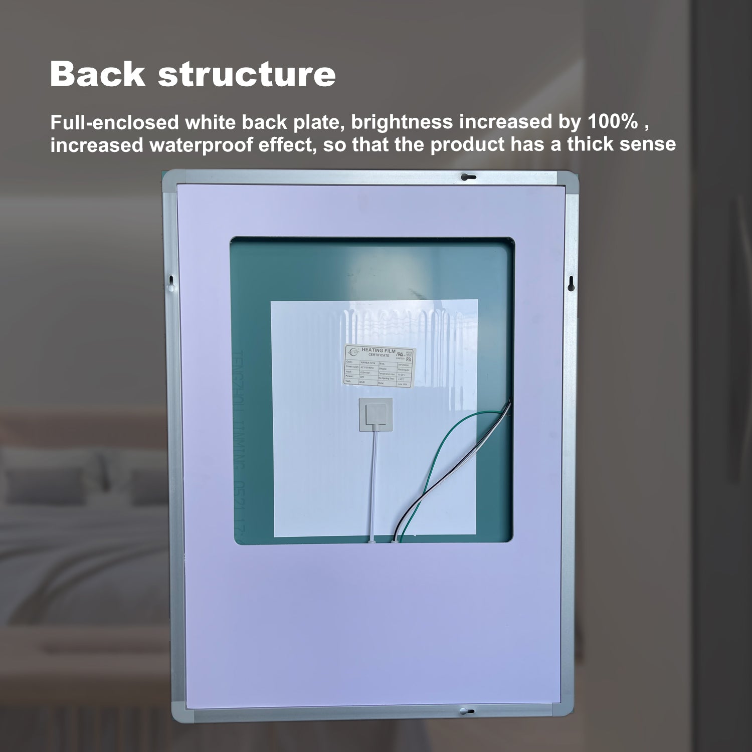 32x24 inch bathroom LED premium vanity mirror with focusing back panel, high lumens, dimmable touch, wall switch control, anti-fog, CRI 95 adjustable 3000K-4500K-6000K, IP54 waterproof vertical and horizontal