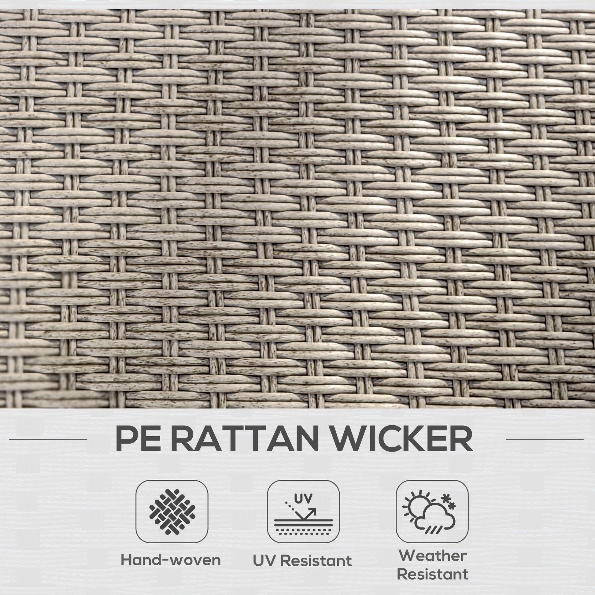 Brighten your backyard and make the exterior of your home just as inviting as the inside. This Outsunny rattan patio furniture set is made of strong steel frame with all-weather PE rattan wicker. Excellent seating choice for your terrace, patio, porch, poolside, or garden area. Decorative and functional, the patio sectional furniture set creates an inviting setting that you and your family will want to use all throughout the year. Features: - PE wicker patio furniture set with two side chairs, an armless chair, a stool, and a matching coffee table - Adaptable stool can be seat, ottoman, or a table when the cushion is removed - Steel frame with a powder coat for strength and outdoor endurance - Handwoven PE rattan has a classic wicker look and is water-safe - Comfy cushions. Seat cushion covers zip off for easy removal and cleaning, back cushion covers are not removable - Suitable for gardens, balconies, and patios - It requires single people half an hour to install Specification: - Color: Natural, Light Gray - Material: Steel, PE Rattan, Polyester - Side Chair Dimension: 25.6" W x 25.6" D x 28.3" H - Armless Chair Dimension: 23.6" W x 25.6" D x 28.3" H - Stool/ Coffee Table Dimension: 23.6" L x 23.6" W x 12.2" H - Seat Size: 22.8" W x 22.8" D - Seat Height (without Cushion): 12.2" - Back Size: 23.6" W x 15.7" L - Cushion Thickness: 3.1" - Weight Capacity: Single Seat/ Stool: 265 lbs, Table: 65 lbs - Item Label: 860-306V01LG Package Includes: - 2 x Side Chair - 1 x Armless Chair - 1 x Stool - 1 x Table - 4 x Seat Cushion - 3 x Back Cushion - 1 x Manual.