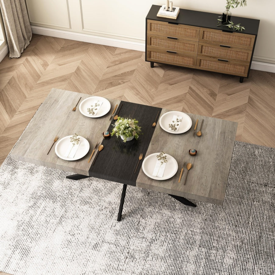 55.11-70.86 Retro Rectangular Stretch Dining Table, Grey Carole Top With Black Embossed Center Pl