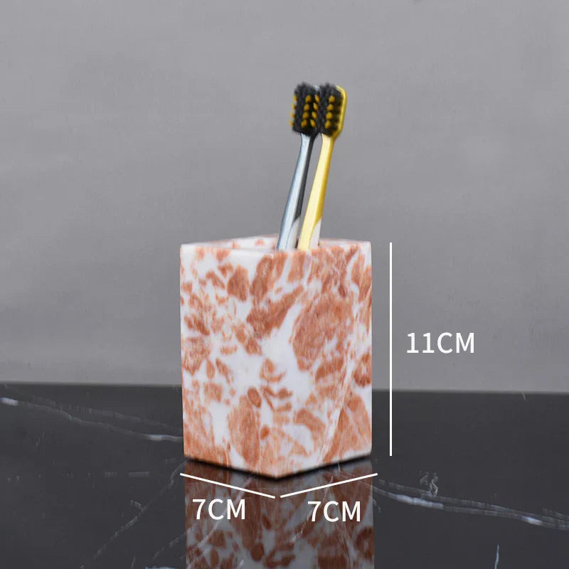 أضف لمسة من الفخامة إلى روتينك اليومي مع طقم الحمام الرخامي الرائع هذا. ارتقِ بديكور حمامك بجمال الرخام الطبيعي الخالد. تألق بمجموعة إكسسوارات الحمام الرخامية الوردية المرجاني من ديكوربايتس.