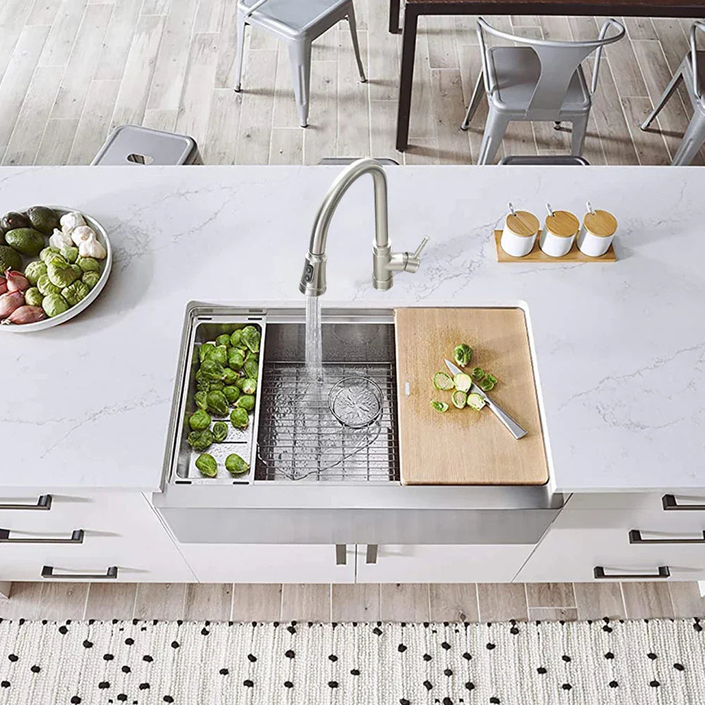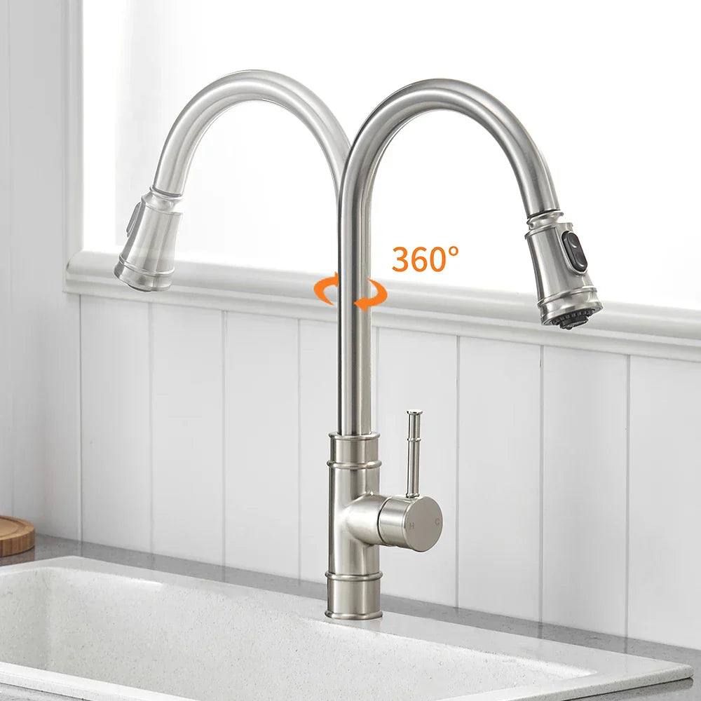 سواءً كنت تغسل الصحون أو تملأ الأواني، يوفر هذا الصنبور تدفقًا قويًا للمياه بفضل خاصية الرش القابل للسحب. يضمن صنبور الماء الدوار بزاوية 360 درجة أقصى درجات الراحة والمرونة في مهام مطبخك اليومية.