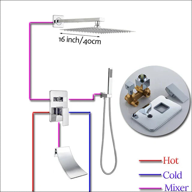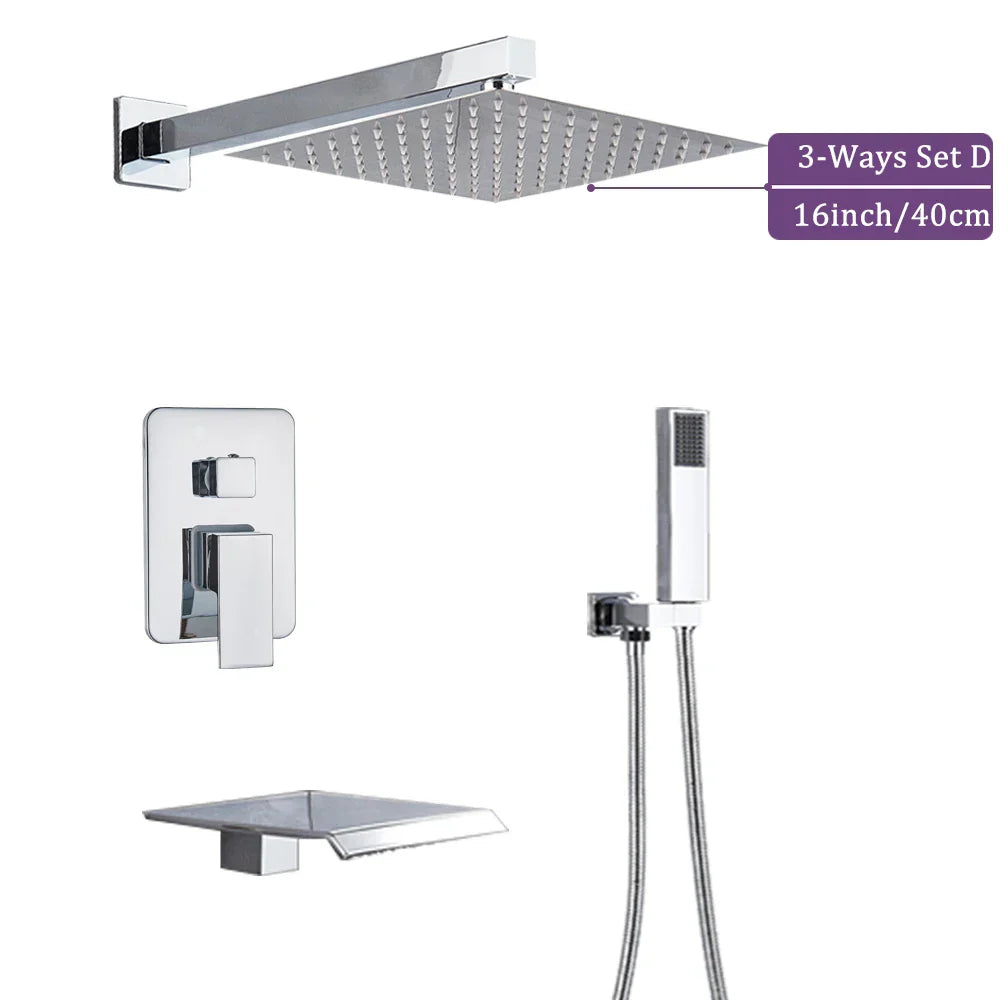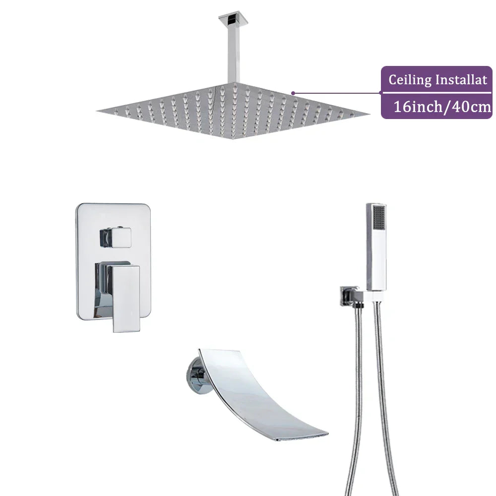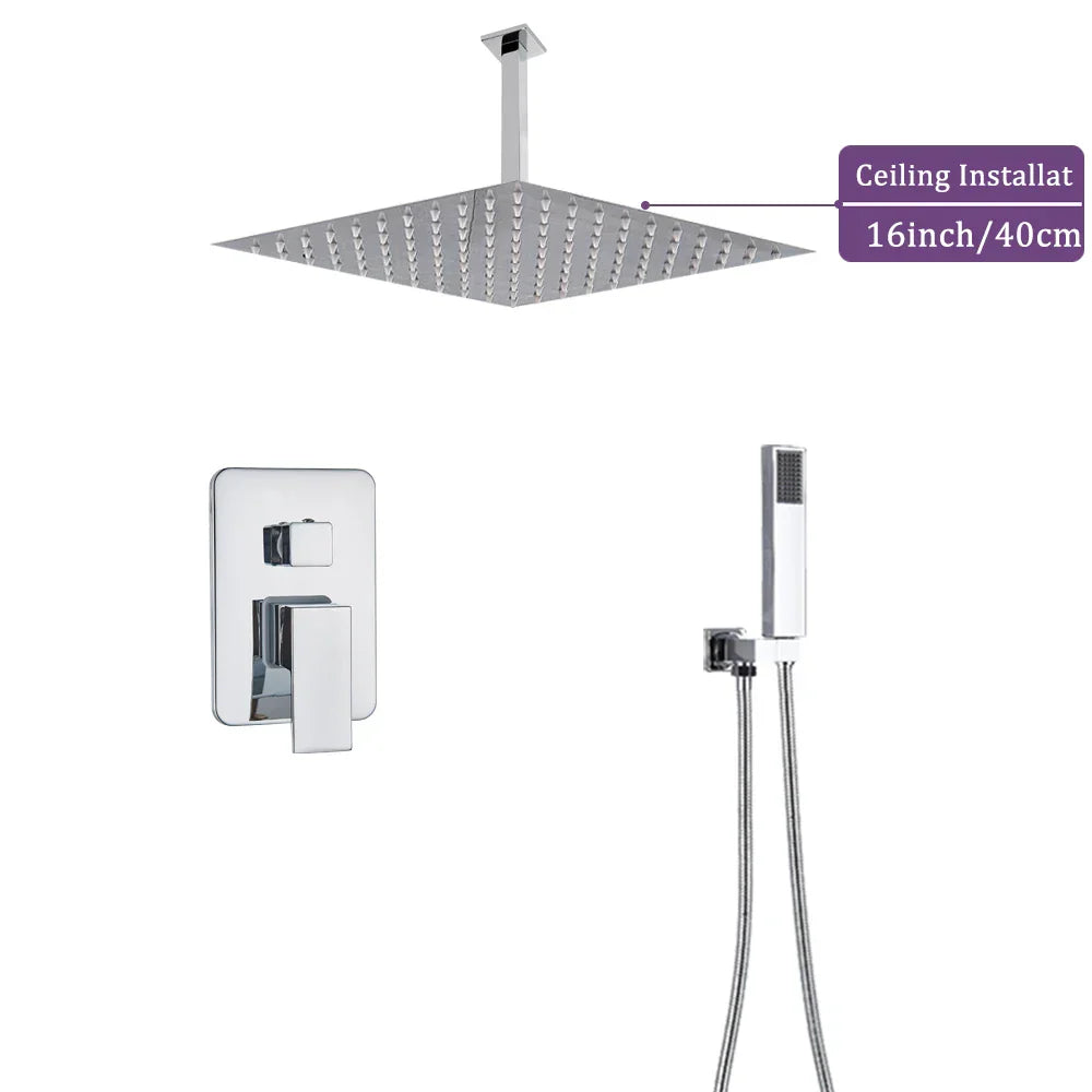 استمتع بتجربة استحمام فاخرة مع طقم حنفية دش المطر الكبير مقاس 16 بوصة مع دش يدوي وصنبور نحاسي. يتميز طقم الدش الرائع هذا بالرقي والأناقة، وهو مثالي لرفع ديكور حمامك إلى آفاق جديدة.