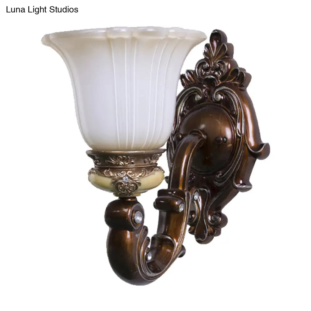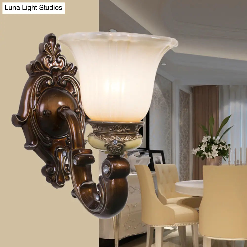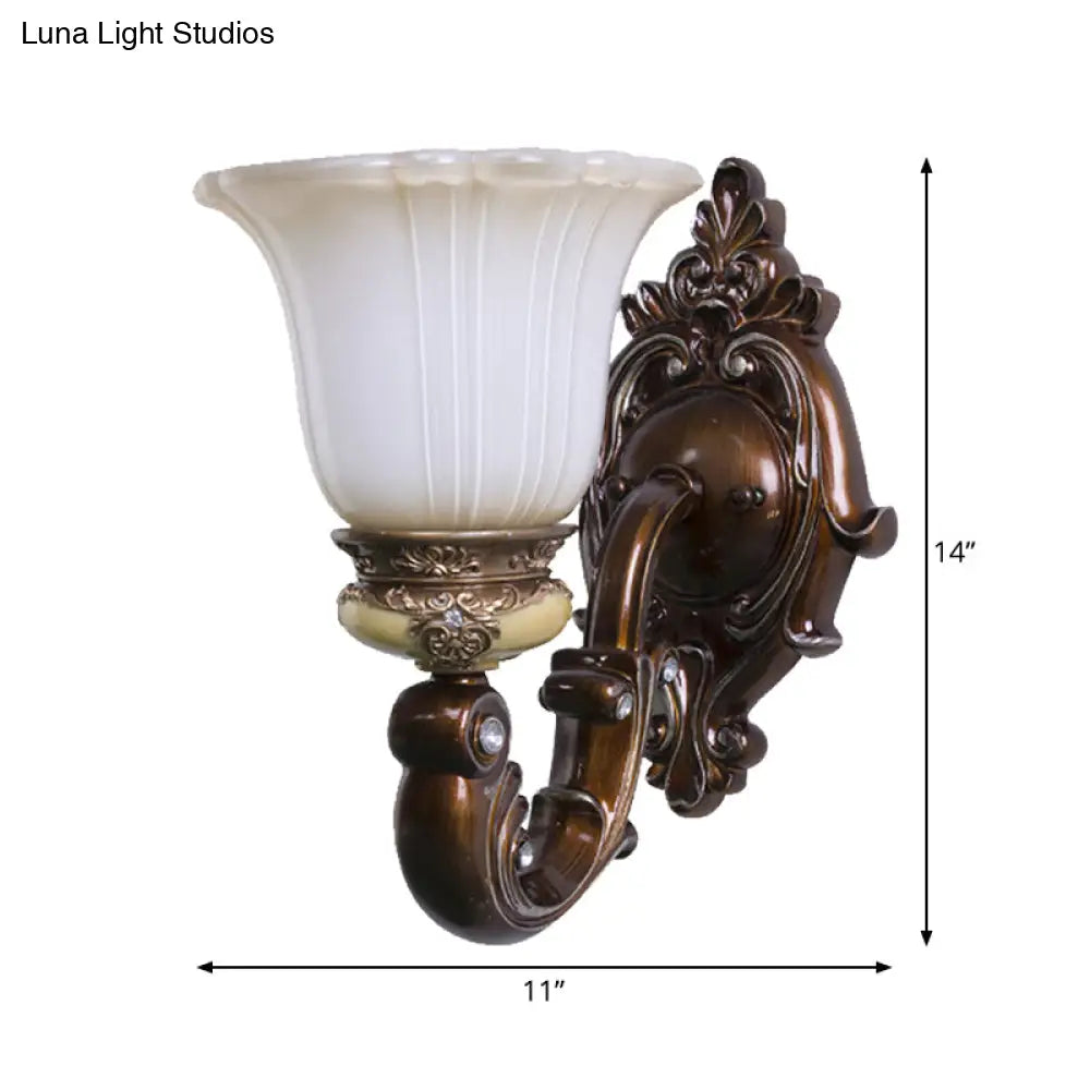 مصباح حائطي بني عتيق بإضاءة واحدة على شكل جرس مع زجاج كريمي مزخرف