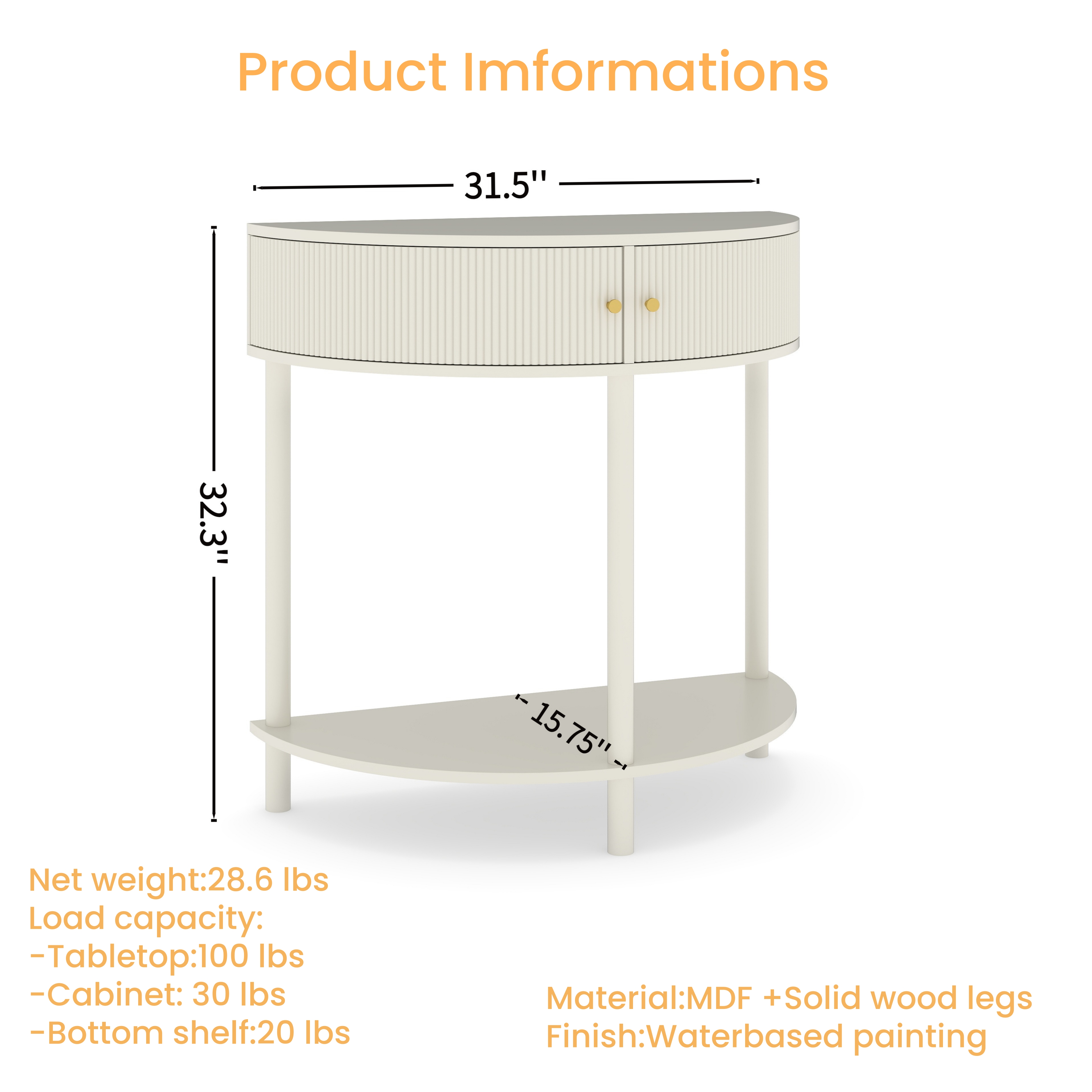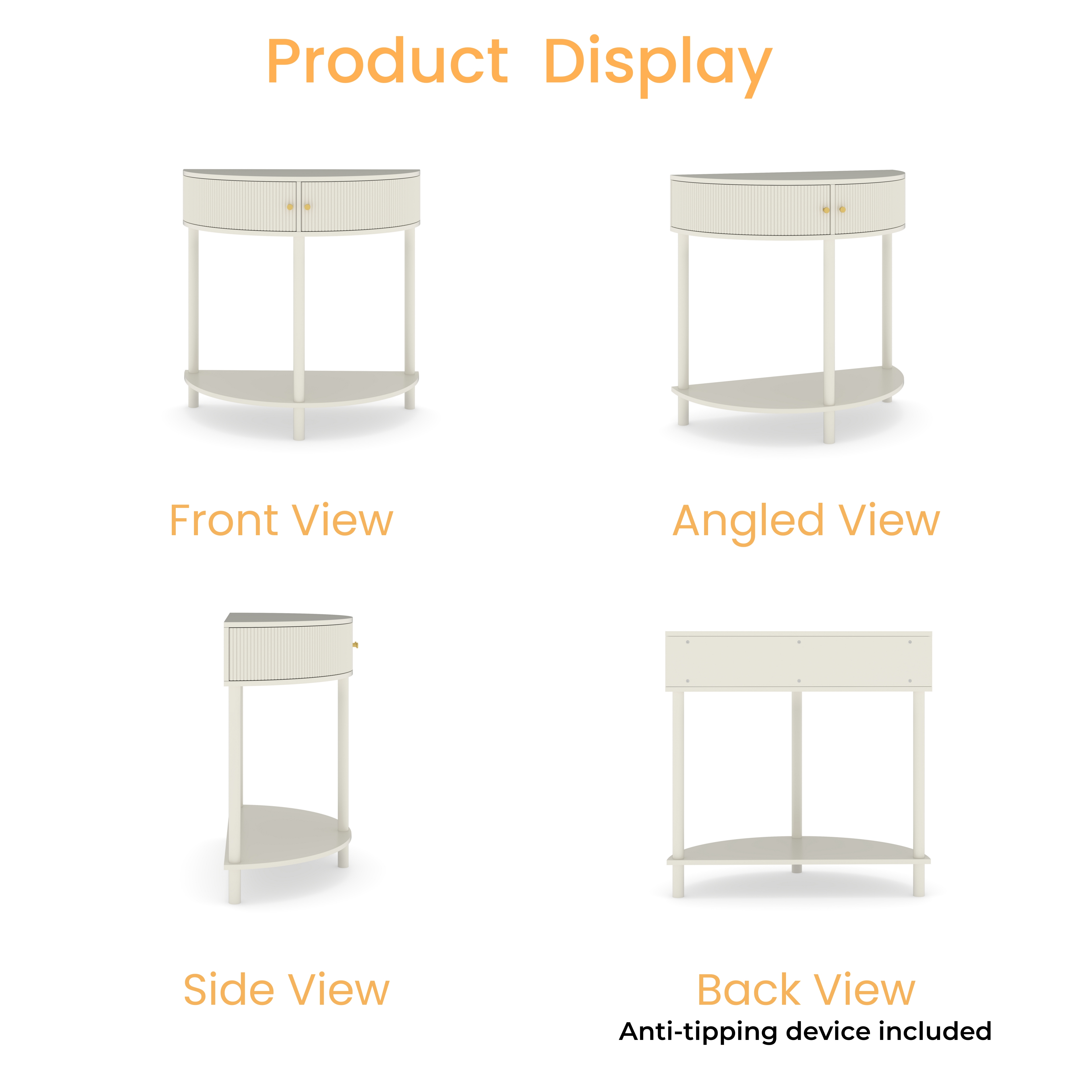 Product Name:Artisan-Crafted Wave-Pattern Demi-Lune Console Table with Creamy White Finish,Unique Half Moon Design End Table with 2 Storage Drawers and Bottom Shelf for Living room, Bedroom, Study, Hallway