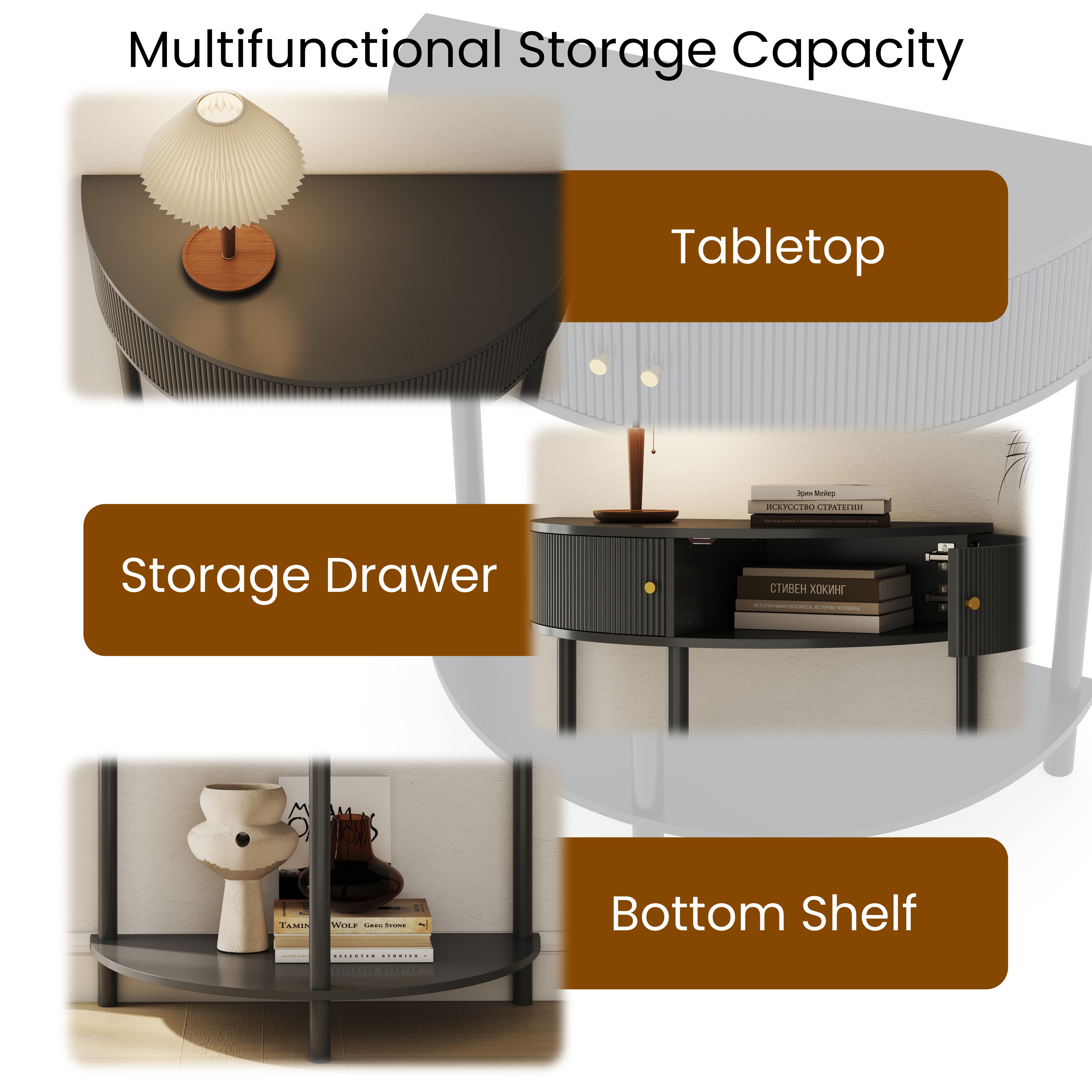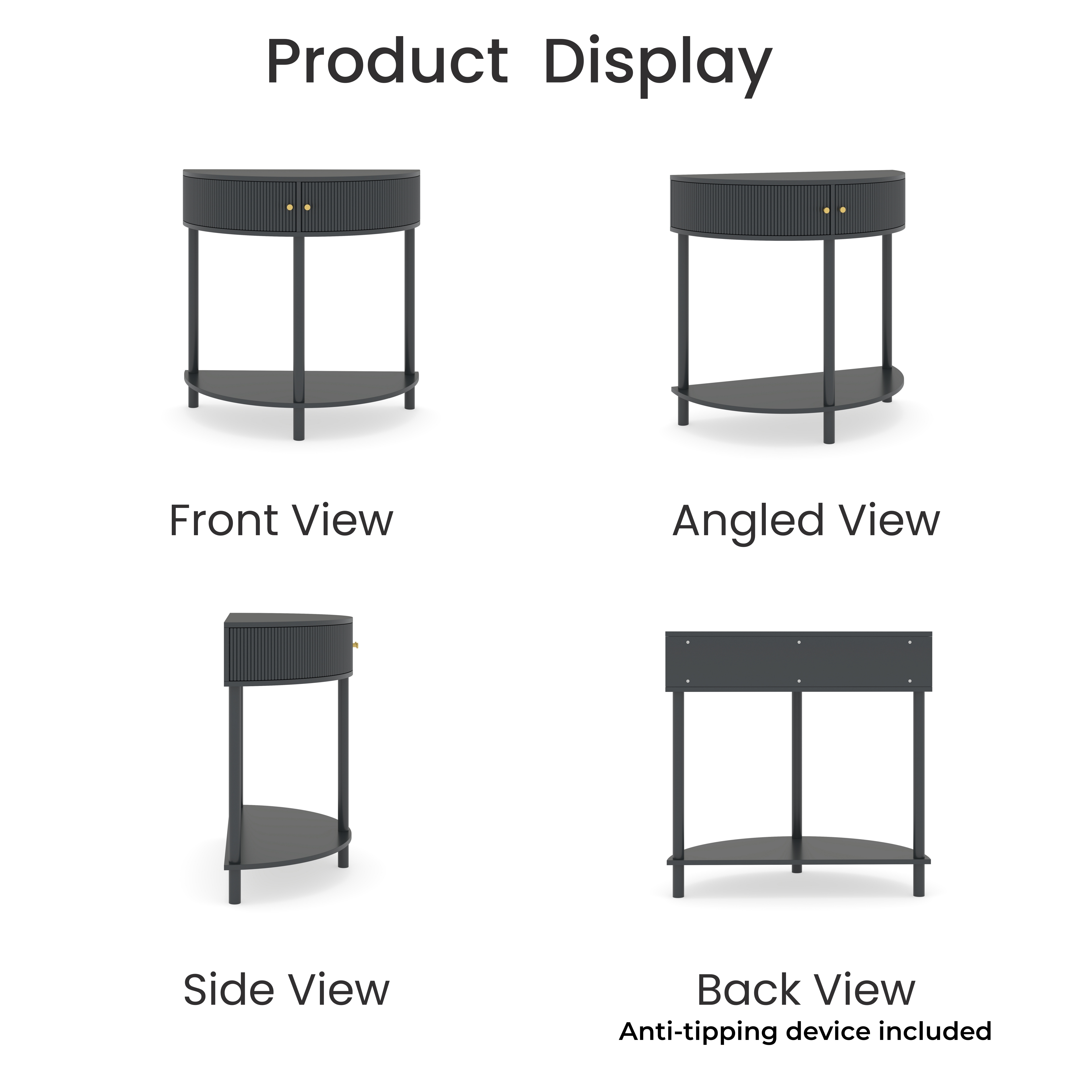 Product Name:Artisan-Crafted Wave-Pattern Demi-Lune Console Table with Dark Gray Finish,Unique Half Moon Design End Table with 2 Storage Drawers and Bottom Shelf for Living room, Bedroom, Study, Hallway