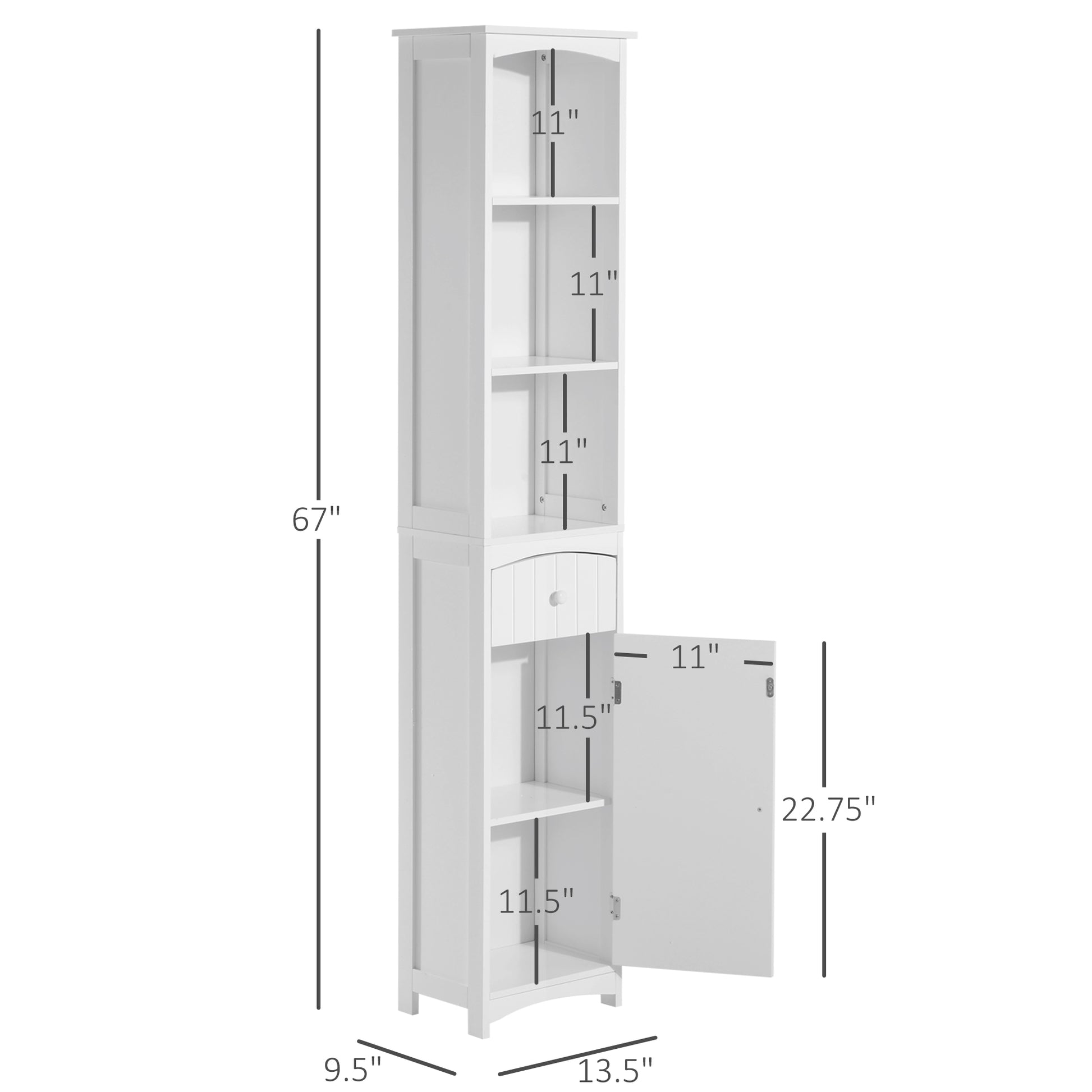This HOMCOM corner cabinet with doors in soft white finish is a great addition to your bathroom area. You can enjoy the ample storage room with three upper shelves, a middle drawer, and a fully closed at the bottom. With this slim bathroom storage cabinet, you can reasonably store your bathroom essentials and keep the bathroom clean and tidy. Stylish and functional, a great item to enhance your home décor. Features: - This tall, modern multipurpose cabinet will match all kinds of furniture - Ample storage space with three level open shelves for displaying accents, a drawer and bottom for everyday bathroom necessities - Solid and stable MDF construction in the classic and pure white finish - Lower half includes a drawer and a with two shelves interior - The slim design is suitable for limited space - Elevated feet will protect it from moisture and maintain ventilation - Assembly required Specification: - Color: White - Material: MDF - Overall Dimensions: 13.5" W x 9.5" D x 67" H - Upper Shelf Dimensions: 11" W x 8.5" D x 11" H - Inner Drawer Size: 10.75" W x 7" D x 4" H - Inner Shelf: 11.5" W x 7.75" D x 11.25" H - Weight Capacity: 22lbs. (each tier) - Item Label: 834-077 Package Includes: - 1 x Bathroom Cabinet - 1 x Manual Having a stylish storage option has never been easier! This free standing tall bathroom cabinet from HOMCOM fits nicely with any decor and can be used in the bathroom, kitchen, pantry, or garage. Constructed of solid engineered wood, it features 2 shelves and two double-tier cabinets with doors. It provides a spacious open area for your coffee maker and photos. Add much-needed storage to your home today with this functional narrow bathroom cabinet from HOMCOM!. Features: - Elegant design, ideal for bathroom, kitchen, and more - Premium engineered wood board construction adds to its durability and stability - Features 2 door-cabinets and 2 shelves for storing and displaying daily essentials - Adjustable cabinet shelf for easy adjustment - Features anti-tipping design, can be fixed to the wall for added security - Easy to clean surface - Assembly required Specification: - Color: White - Material: MDF, Particle Board - Overall Dimensions: 15.75"W x 11.75"D x 67"H - Weight Capacity:110 lbs - Shelf Capacity:22 lbs./per tier Package Includes: 1 x Storage Cabinet; 1 x Bag of Fittings; 1 x Instructions If you need more storage space in your bathroom so you don't have to store half your stuff in the bathroom and half in the hall this bathroom cabinet from kleankin will be your storage-saving grace. This cabinet can store shower accessories, toilet paper, and towels all in a spot. It's compact enough not to take up much floor space so it won't be in the way. Take back your bathroom space and stop doing the math about what will fit with this floor bathroom cabinet from kleankin. Features: - Compact and tall cabinet fits in narrow spaces - Constructed of MDF board for easy cleaning - Features a 3-tier open shelf, a drawer and an enclosed for lots of storage and organization - Adjustable shelf to meet your different storage needs - Painted surface for easy cleaning and maintenance - Anti-tipping design ensures your safety - Assembly required Specification: - Color: White, Grey - Material: MDF - Overall Dimensions: 13.5" W x 11.75" D x 64.25" H - Shelf Dimensions: 11.5" W x 11.25" D x 10.25" H - Inside Drawer Dimensions: 9.75" W x 9.75" D x 3.75" H - Inside Dimensions: 11.75" W x 10.5" D - Middle level height: 11.5" - Each level Adjustable: 2.5" - Max Load: 110 lbs. (total), 11 lbs. (shelf), 7 lbs. (drawer) - Item Label: 834-364LG Package Includes: - 1 x Bathroom Cabinet - 1 x Manual Do you need more storage space in your bathroom? Of course you do. This toilet roll holder with a shelf from kleankin gives you that extra boost you need. This bathroom cabinet fits into those tight corner spaces that otherwise get left empty. Use that extra space to store daily hygiene products, cleaning supplies, or towels. Don't be stuck putting everything in the hallway wardrobe; keep what you need close by when you need it with the kleankin bathroom floor cabinet. Features: - Four open shelves and two 2-tier cabinets neatly arrange your towels, linen, and other bathroom essentials - The shelves inside the cabinets are 3-level adjustable for flexible storage - Quality steel hinges allow smooth opening and closing of the doors - The melamine surface can prevent water damage - An anti-tipping design is included for added safety - Non-slip pads at the bottom protect your floor from scratches. - Assembly required Specification: - Color: White - Materials: Particle Board - Overall Dimensions: 7.75" W x 7.75" D x 70.75" H - Top Shelf Size: 7" W x 7" D x 6" H (Each Tier) - Bottom Shelf Size: 7" W x 7" D x 8.75" H - Top Cabinet Inner: 7" W x 6.25" D x 6.75" H (Each Tier) - Bottom Cabinet Inner: 7" W x 6.75" D x 9.5" H (Each Tier) - Drawer Inner Size: 5.75" W x 6" D x 5.5" H - Weight Capacity: 66 lbs. (Shelf) - Item Label: 834-625V80WT Package Includes: - 1 x Bathroom Cabinet - 1 x Manual Do you need more storage space in your bathroom? - Assembly required Specification: - Color: Gray - Materials: Particle Board - Overall Dimensions: 7.75" W x 7.75" D x 70.75" H - Top Shelf Size: 7" W x 7" D x 6" H (Each Tier) - Bottom Shelf Size: 7" W x 7" D x 8.75" H - Top Cabinet Inner: 7" W x 6.25" D x 6.75" H (Each Tier) - Bottom Cabinet Inner: 7" W x 6.75" D x 9.5" H (Each Tier) - Drawer Inner Size: 5.75" W x 6" D x 5.5" H - Weight Capacity: 66 lbs. (Shelf) - Item Label: 834-625V80GY Package Includes: - 1 x Bathroom Cabinet - 1 x Manual.