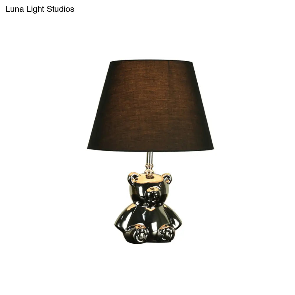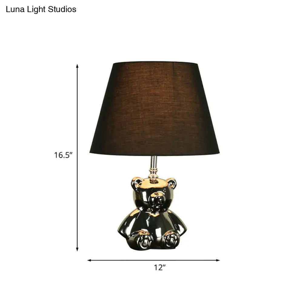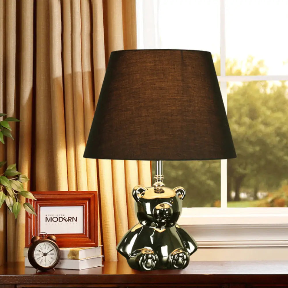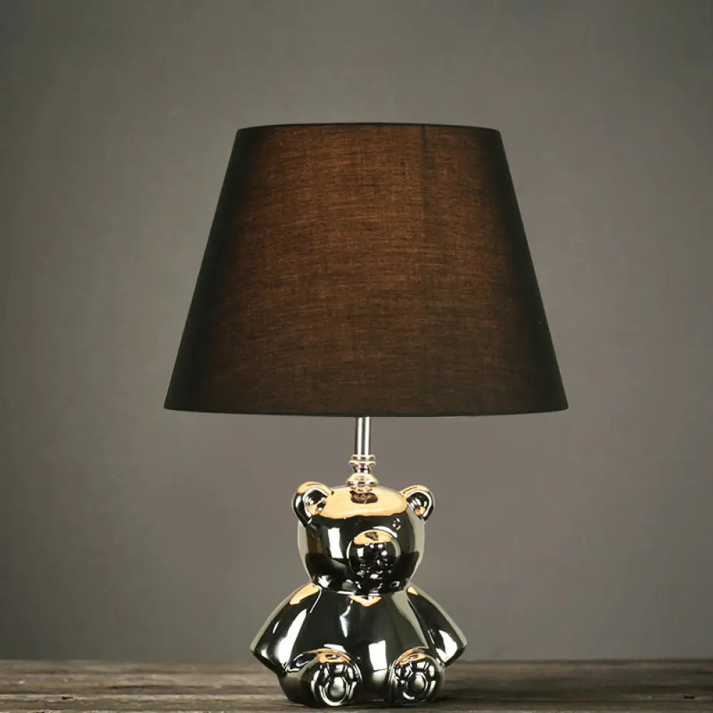 مصباح طاولة سيراميكي على شكل دب ريفي مع إضاءة ليلية فضية/ذهبية، وغطاء قماشي أسطواني مدبب