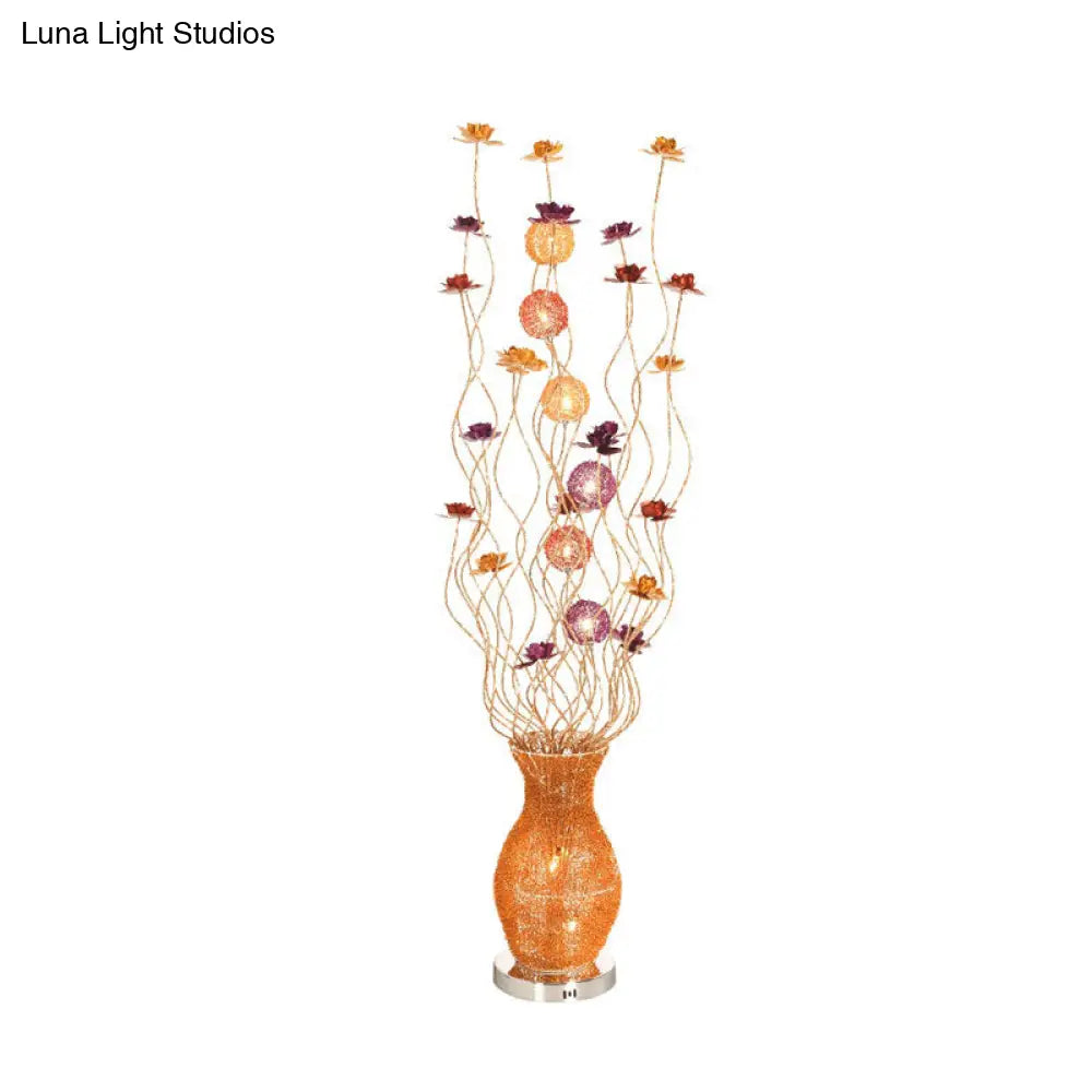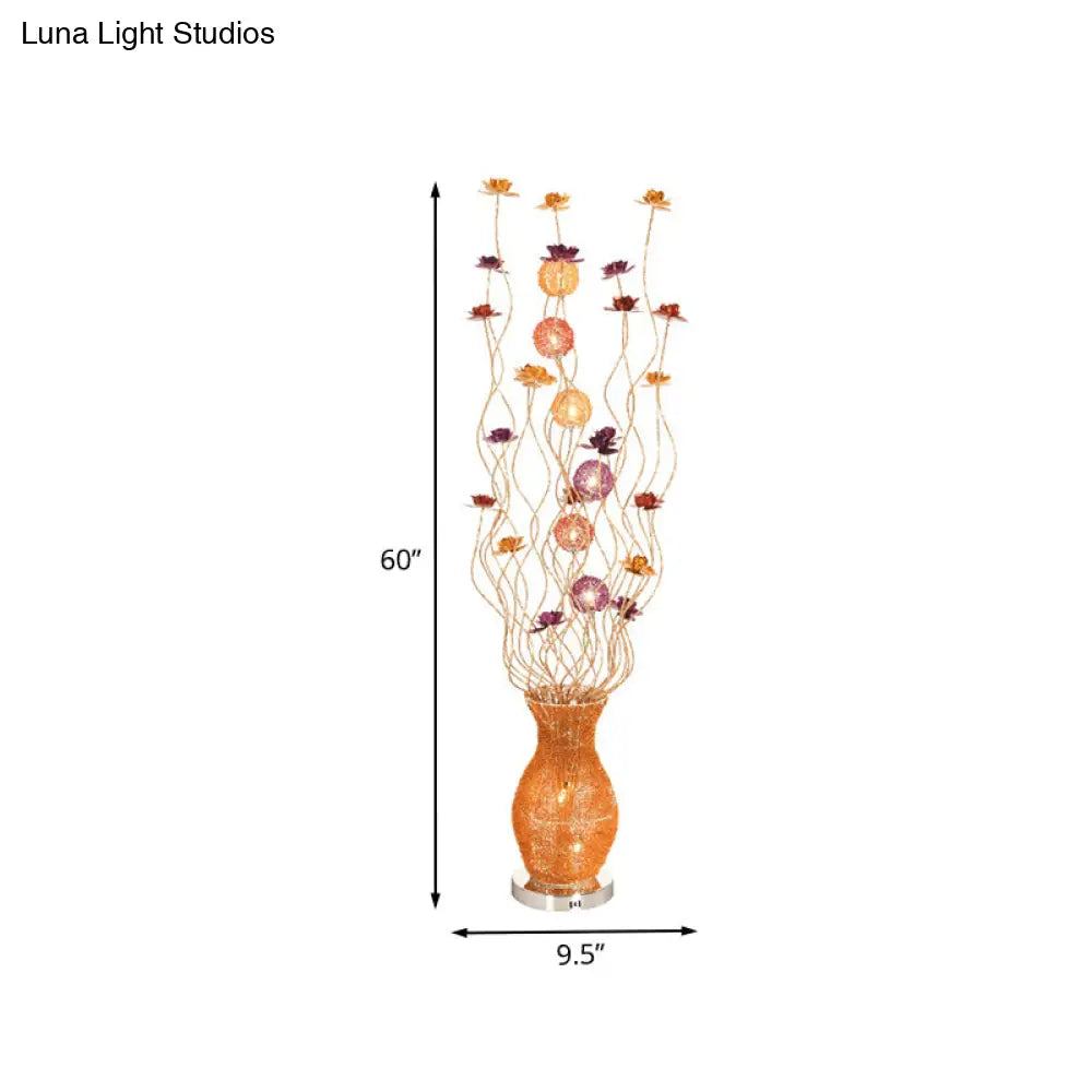 مصباح أرضي منحني من الألومنيوم مع إضاءة LED وديكور زهور وقاعدة مزهرية باللون الذهبي