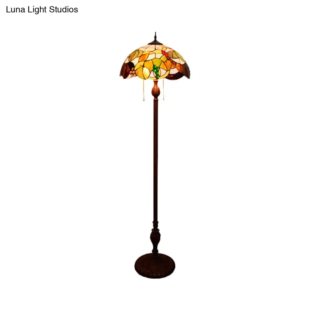 مصباح أرضي من النحاس مع زجاج مقطوع بشكل صدفي ونمط أوراق البحر الأبيض المتوسط والعنب - 3 لمبات