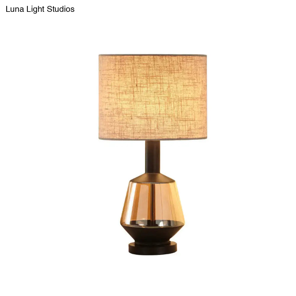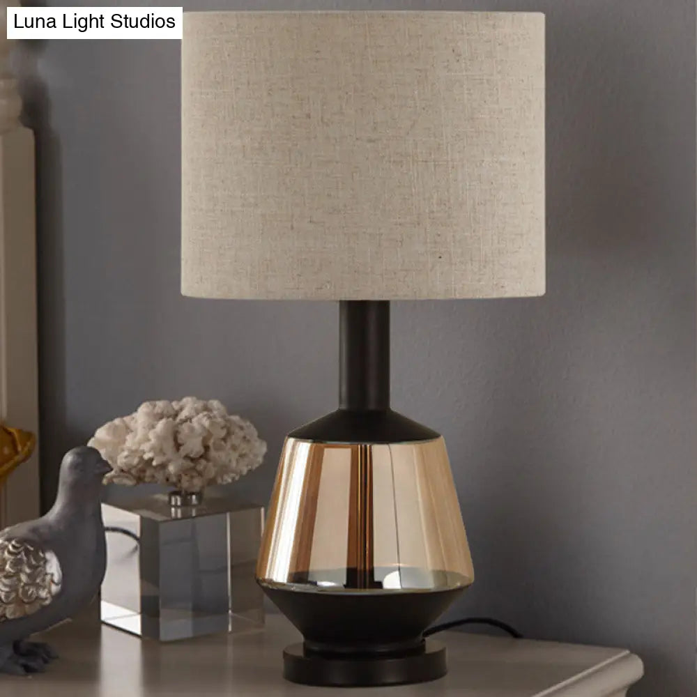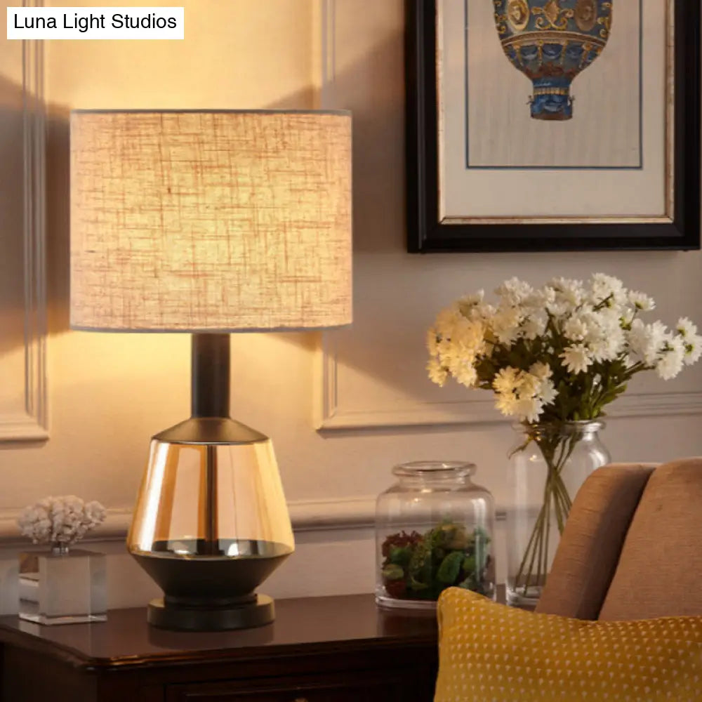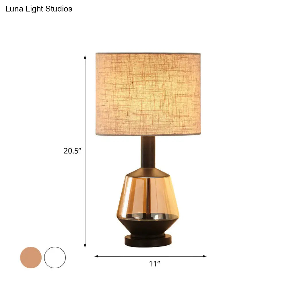 مصباح طاولة بجانب السرير على شكل أسطوانة ريفية مع قاعدة زجاجية بلون العنبر - غطاء قماش أبيض/بيج