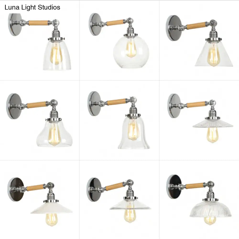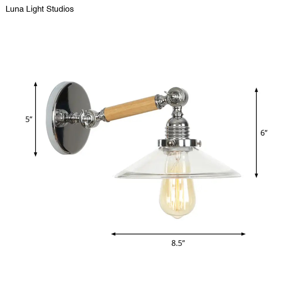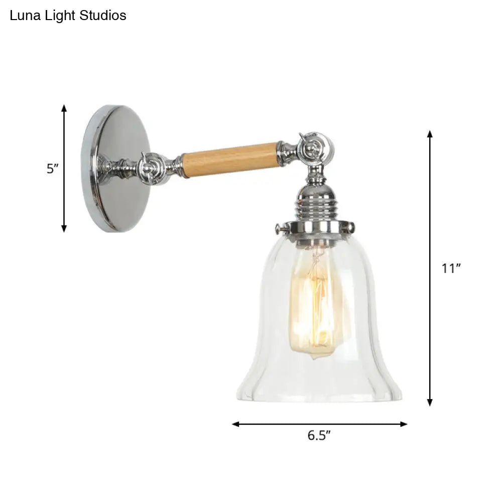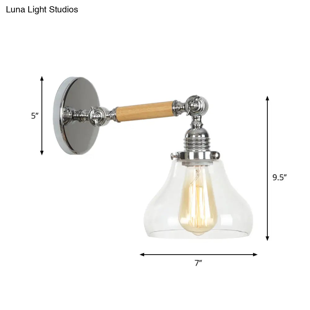 مصباح حائط ريفي من DecorBites™ مزود بمصباح واحد - تصميم وعاء/مخروط/جرس دوار من الزجاج الشفاف، مصنوع من الكروم والخشب