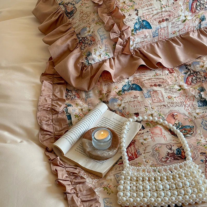 طقم سرير DecorBites™ من القطن بنسبة 100% بطبعة فرنسية وكشكشة من الدانتيل - طقم سرير مكون من 4 قطع