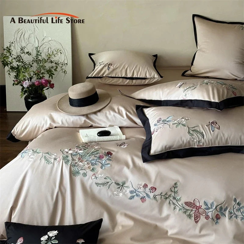 طقم مفروشات سرير DecorBites™ مطرز بنقشة زهور الفراشة من القطن 1000TC مع غطاء لحاف وملاءة وأغطية وسائد