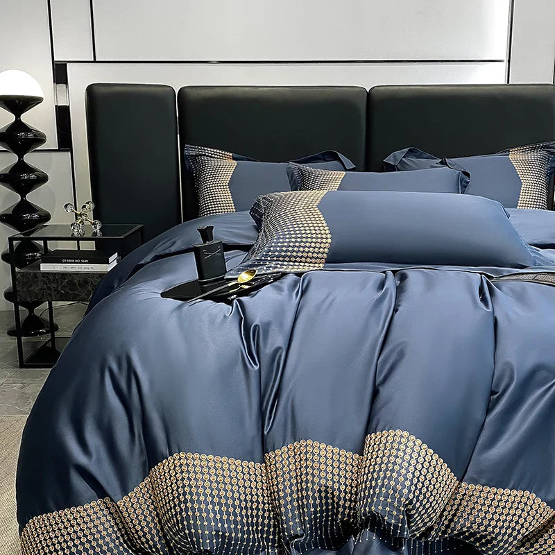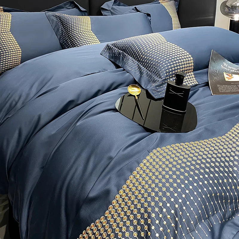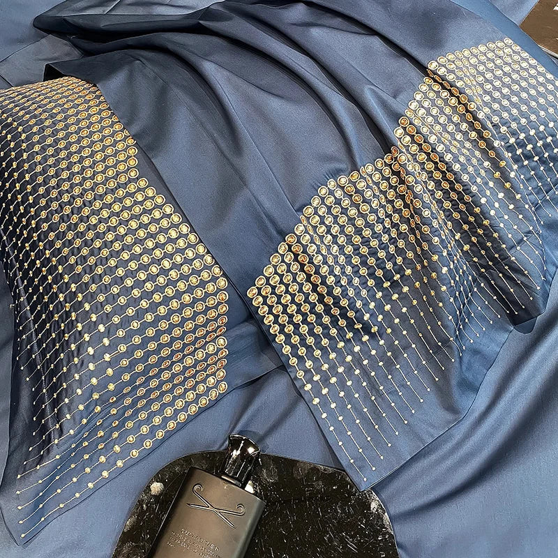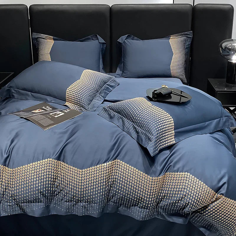 طقم مفروشات فاخر مطرز من القطن DecorBites™ 1000TC باللون الأزرق والأبيض والشمبانيا