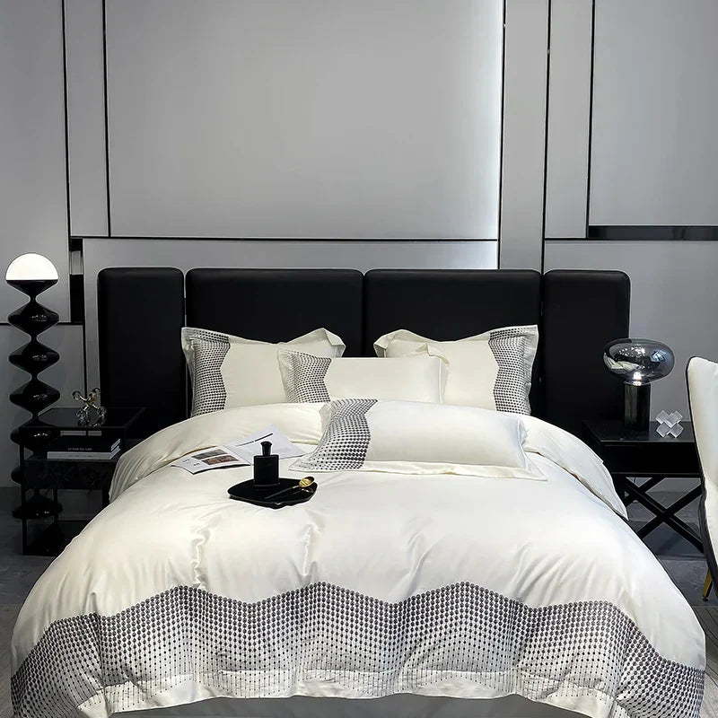 صُنع طقم الفراش هذا من قماش 1000TC عالي الجودة، وهو فاخر ومتين. تُضفي تفاصيل التطريز لمسةً من الأناقة، ما يجعله خيارًا مثاليًا لعشاق الحرفية الراقية.