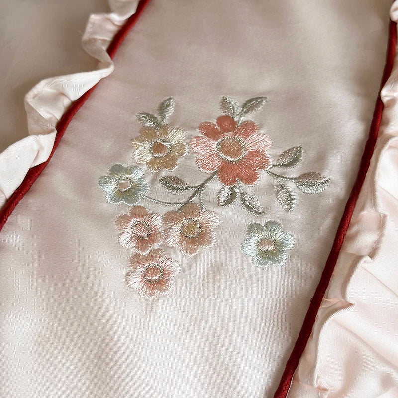 صُمم طقم الفراش هذا بمواد عالية الجودة، ويتميز بنسيج 1000TC، مما يضمن ملمسًا فاخرًا على بشرتك. يُضفي التطريز وكشكشة الدانتيل لمسة من الرقي، بينما يُضفي تصميم زفاف الأميرة الفرنسية سحرًا رومانسيًا.