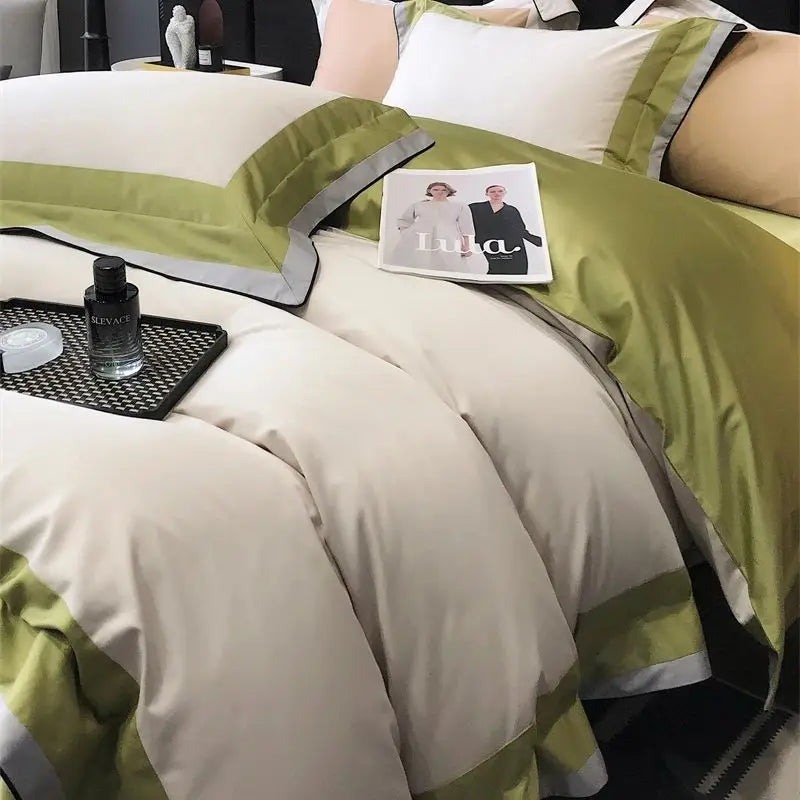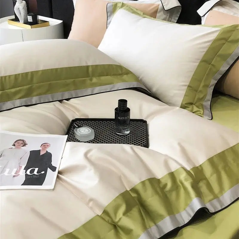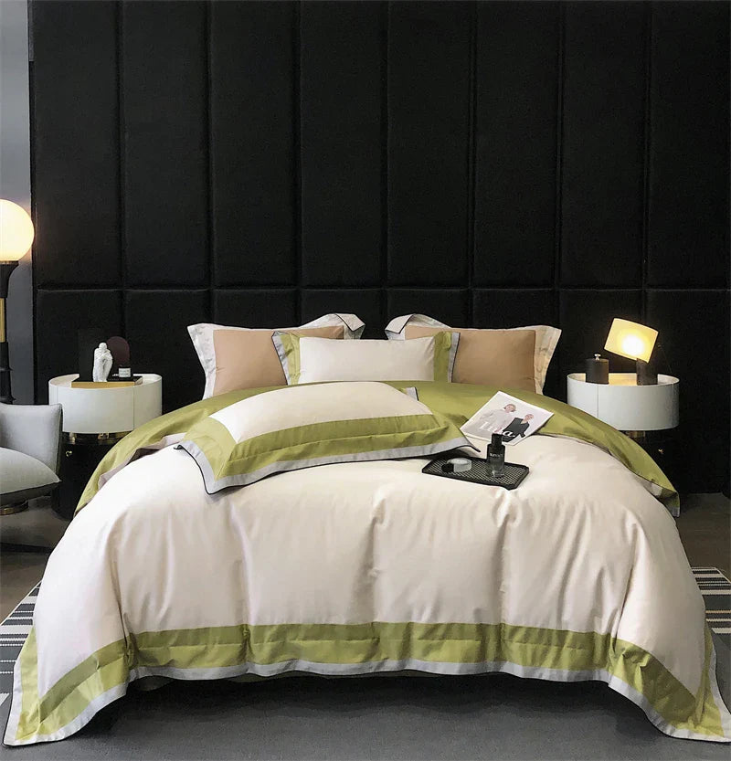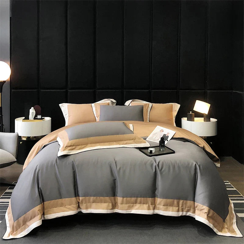 صُنع طقم الفراش هذا من قماش عالي الجودة بتقنية 1000TC، ليمنحك أقصى درجات الراحة والفخامة. غطاء اللحاف، وغطائي الوسادة، وملاءة السرير، جميعها مطرزة بدقة وعناية، مما يضفي لمسة من الأناقة على ديكور غرفة نومك.