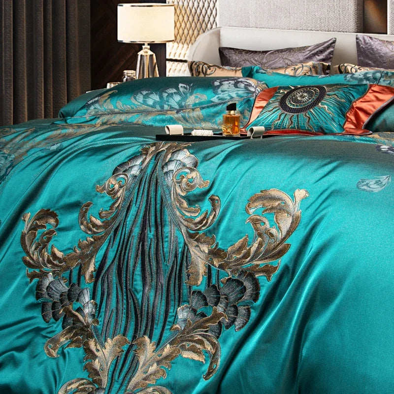 استمتع بملمس فاخر من الحرير والقطن ١٠٠٪، لتنعم بنوم هانئ طوال الليل. يضمن نسيج ١٢٠٠TC عالي الجودة ملمسًا ناعمًا وناعمًا، بينما تُضفي تقنية التطريز لمسةً من الرقي على المجموعة.