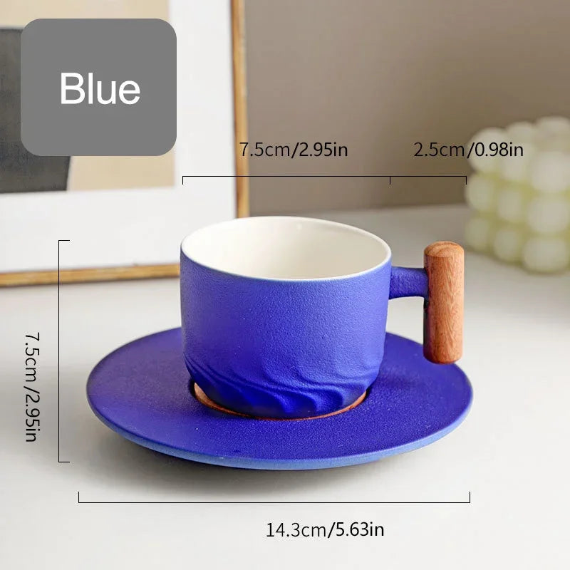 كوب قهوة سيراميكي أزرق بتصميم كلاسيكي، سعة 130 مل، مع صحن، ومقبض خشبي، من ديكوربايتس™