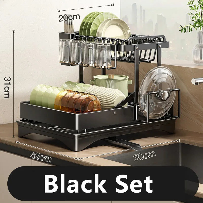 نقدم لكم رفّ تجفيف الأطباق وسلة التصريف بطبقتين، وهو منظم مطبخ أساسي لكل منزل عصري. مصنوع من معدن عالي الجودة، هذا الرف الأنيق والعصري مصمم لزيادة الراحة والكفاءة في مطبخك.