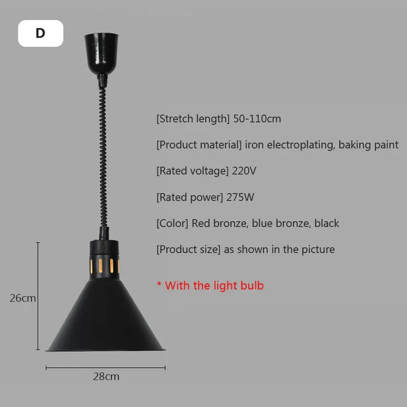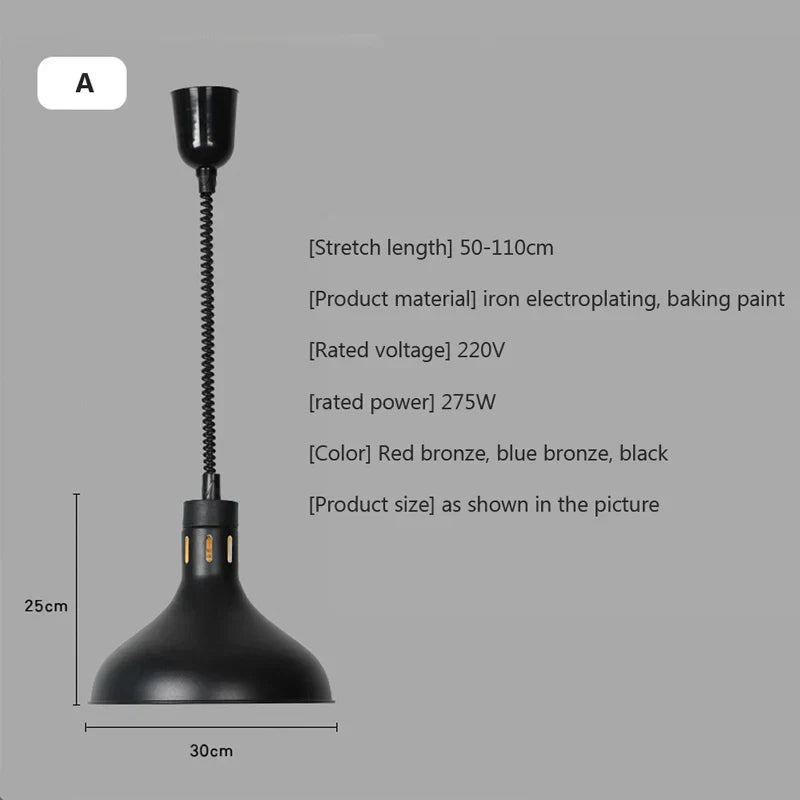 نقدم لكم مصباحًا كهربائيًا لحفظ حرارة الطعام بقوة ٢٧٥ واط، الإضافة المثالية لبوفيه مطبخك أو مطعمك. هذا المصباح المعلق العصري لا يوفر إضاءة غامرة فحسب، بل يحافظ أيضًا على طعامك دافئًا ولذيذًا لفترات طويلة.