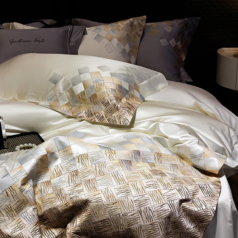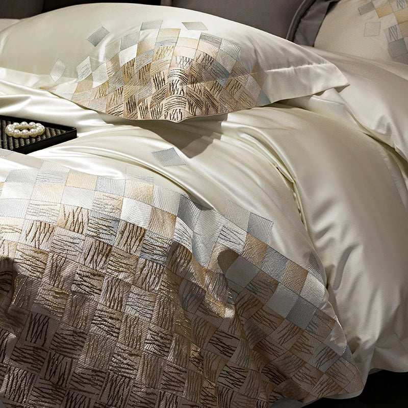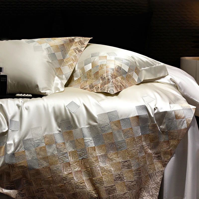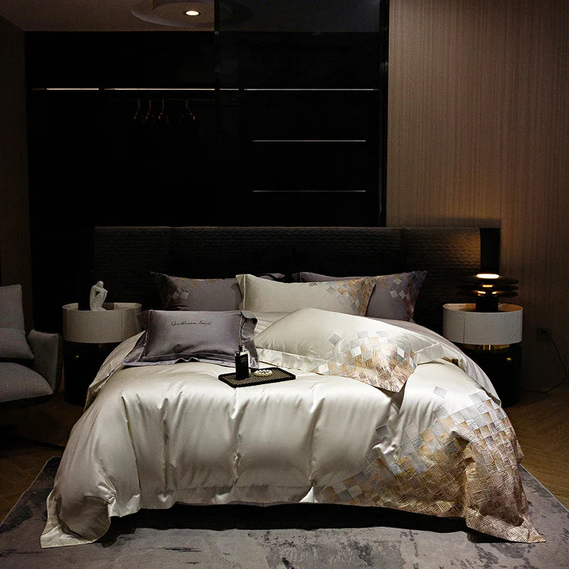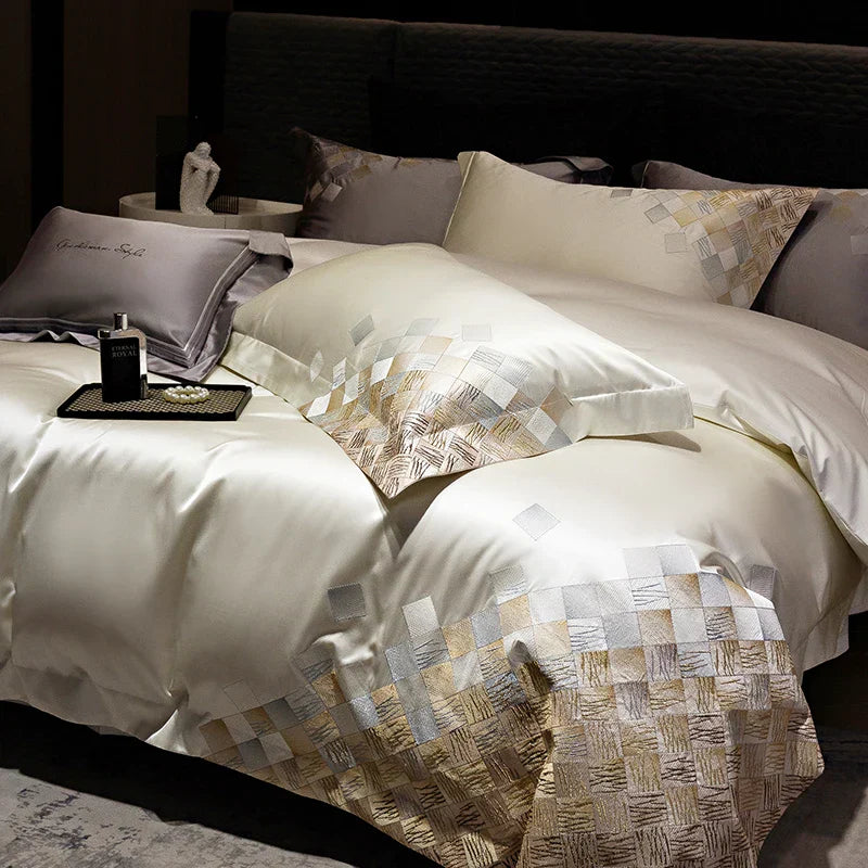 طقم مفروشات سرير فاخرة مطرزة من ديكوربايتس™، مكون من 4 قطع، باللون الأبيض اللؤلؤي/الرمادي، من قماش الساتان والقطن المزخرف