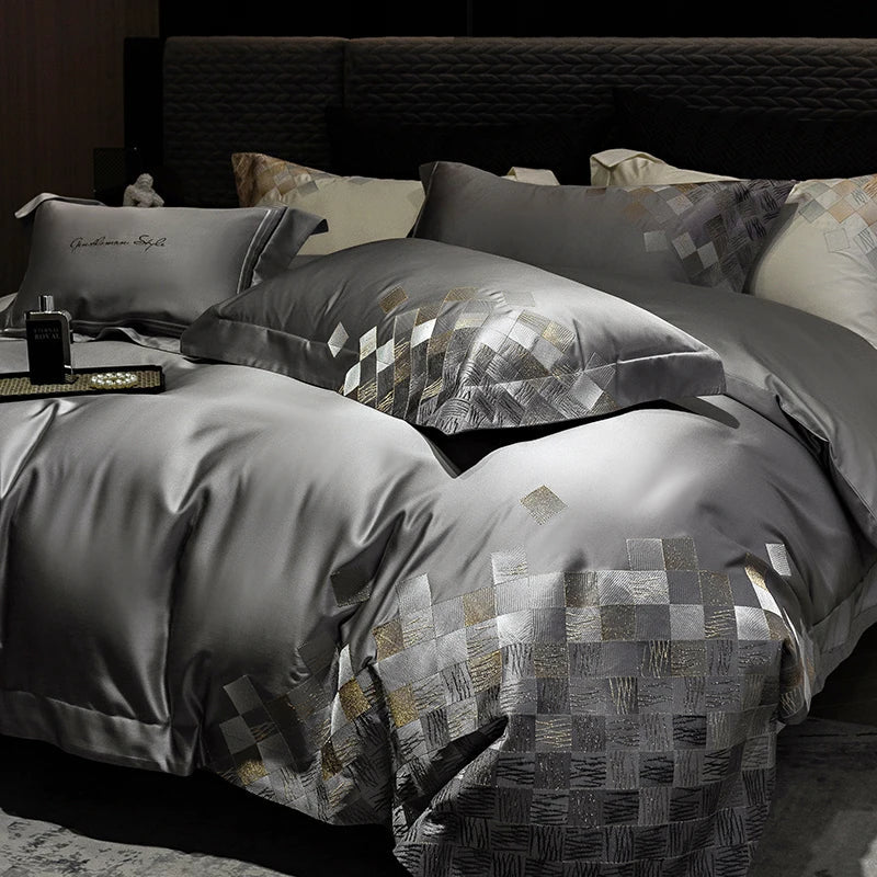دلل نفسك بفخامة مع طقم مفروشات السرير الفاخر المطرّز المكون من 4 قطع، باللون الأبيض اللؤلؤي/الرمادي، من قطن الساتان المطرّز. صُمّم هذا الطقم الرائع ليُضفي لمسةً من الفخامة على ديكور غرفة نومك ويمنحك الراحة القصوى التي تستحقها.