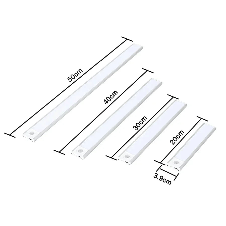 مع أطوال متنوعة (20 سم، 30 سم، 40 سم، 60 سم)، يمكنك اختيار الحجم الأنسب لمساحتك. مصباح الخزانة LED فائق النحافة المزود بمستشعر حركة قابل للتخصيص، مما يمنحك مرونة في تصميمه ليناسب احتياجاتك الخاصة.