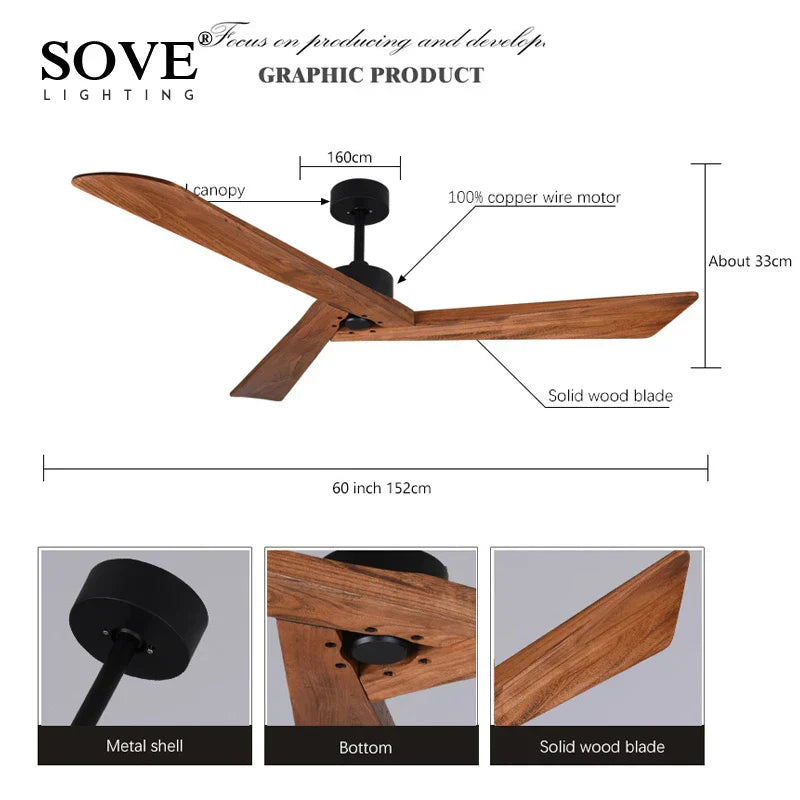 مروحة سقف خشبية DecorBites™ مقاس 60 بوصة مزودة بجهاز تحكم عن بعد لغرفة المعيشة وغرفة الطعام والطابق العلوي تعمل بتيار مستمر 220 فولت