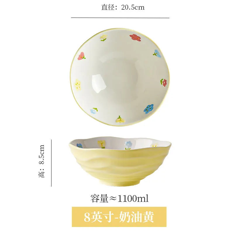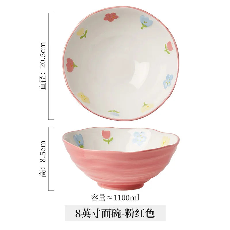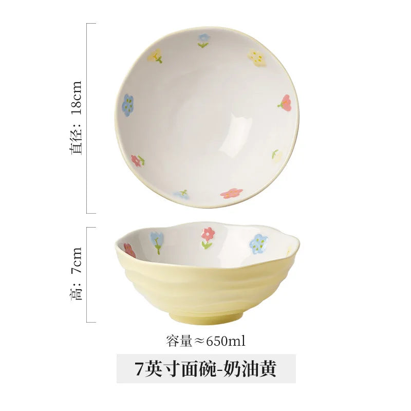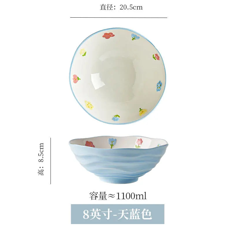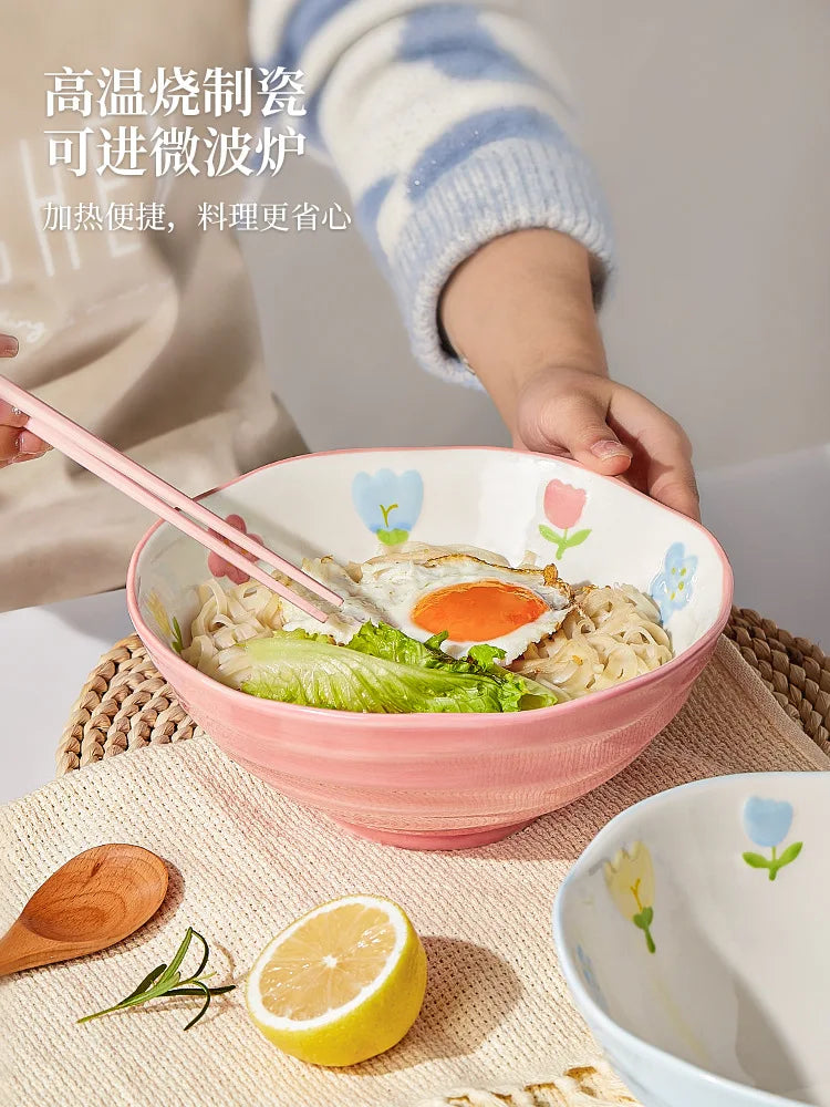 هذا الوعاء المصنوع من سيراميك عالي الجودة، والمزخرف بنقشة زهور، ينضح بالسحر والرقي. بسعة أقل من لتر واحد، يُعد مثاليًا لتقديم كميات وفيرة من النودلز والحساء المفضل لديك. تقنية التزجيج السفلي تمنحه لمسة نهائية ناعمة، مما يعزز جاذبيته البصرية.