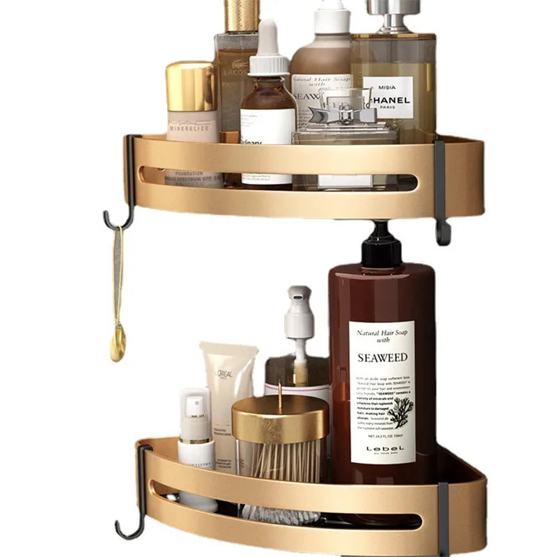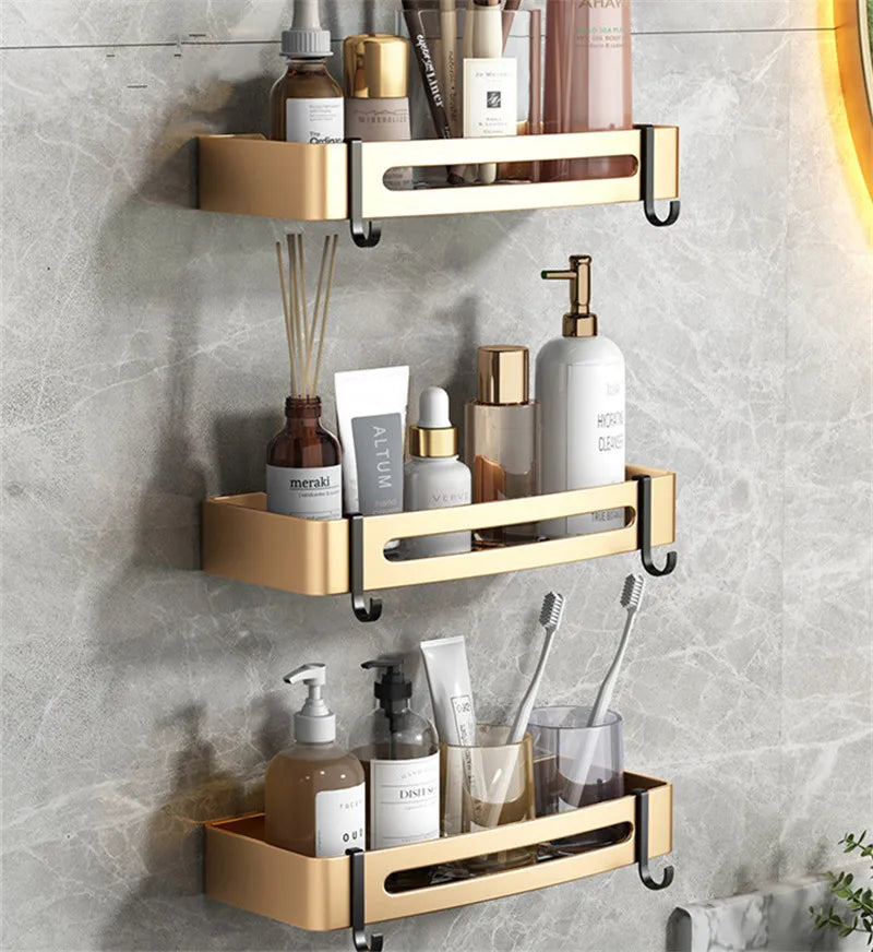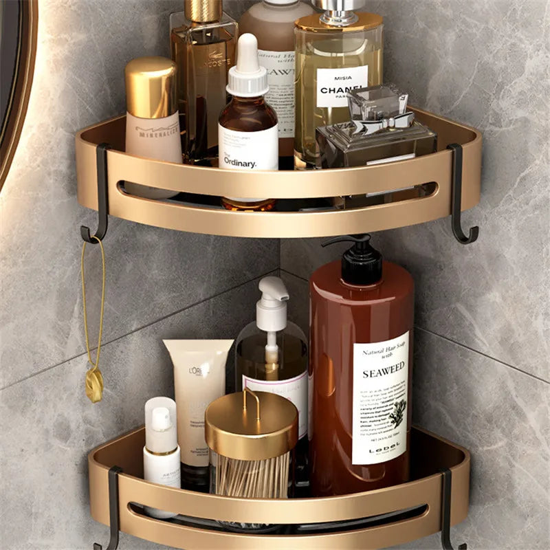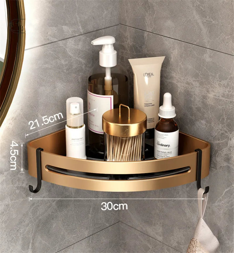 رف الزاوية لدينا مصمم بخبرة ليوفر لك مساحة تخزين واسعة ويضيف لمسة من الرقي إلى ديكور حمامك. يضيف اللون الذهبي المصقول لمسة فاخرة، مما يجعله مثاليًا للحمامات العصرية.