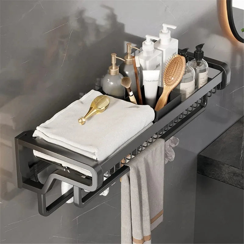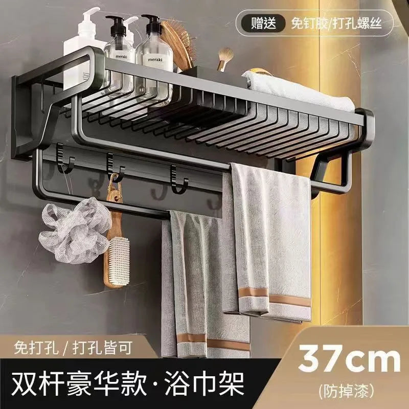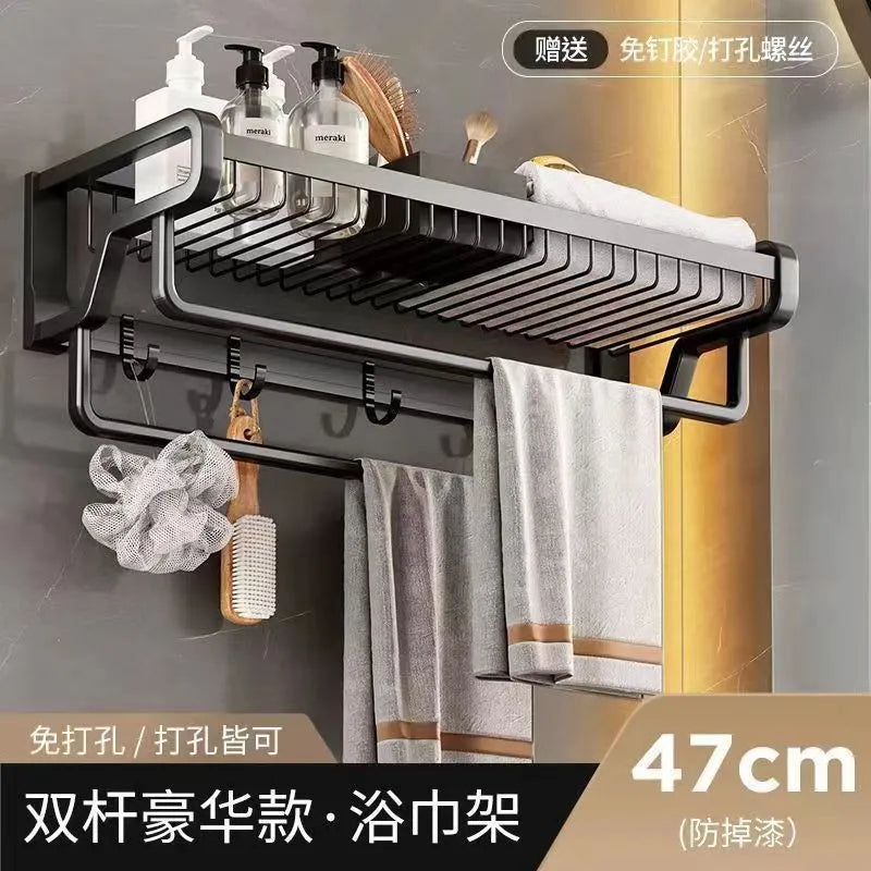 نقدم لكم حامل مناشف الحمام المصنوع من الألومنيوم مع خطاف وسلة تخزين، إضافة أنيقة وعملية لأي حمام. مصنوع من الألومنيوم عالي الجودة، يتميز هذا الحامل بتصميم أنيق وعصري يُضفي لمسةً عصريةً على مساحتك.