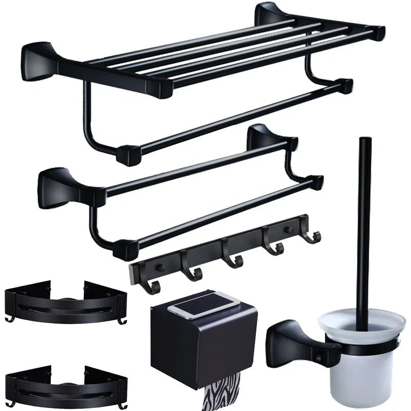 مجموعة أدوات الحمام المصنوعة من الألومنيوم الأسود من DecorBites™: حامل مناشف، حامل ورق، رف زاوية، رف مناشف، حامل فرشاة المرحاض