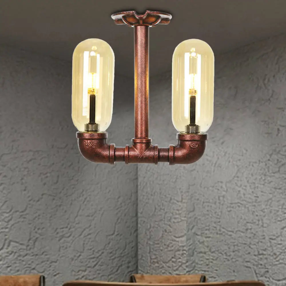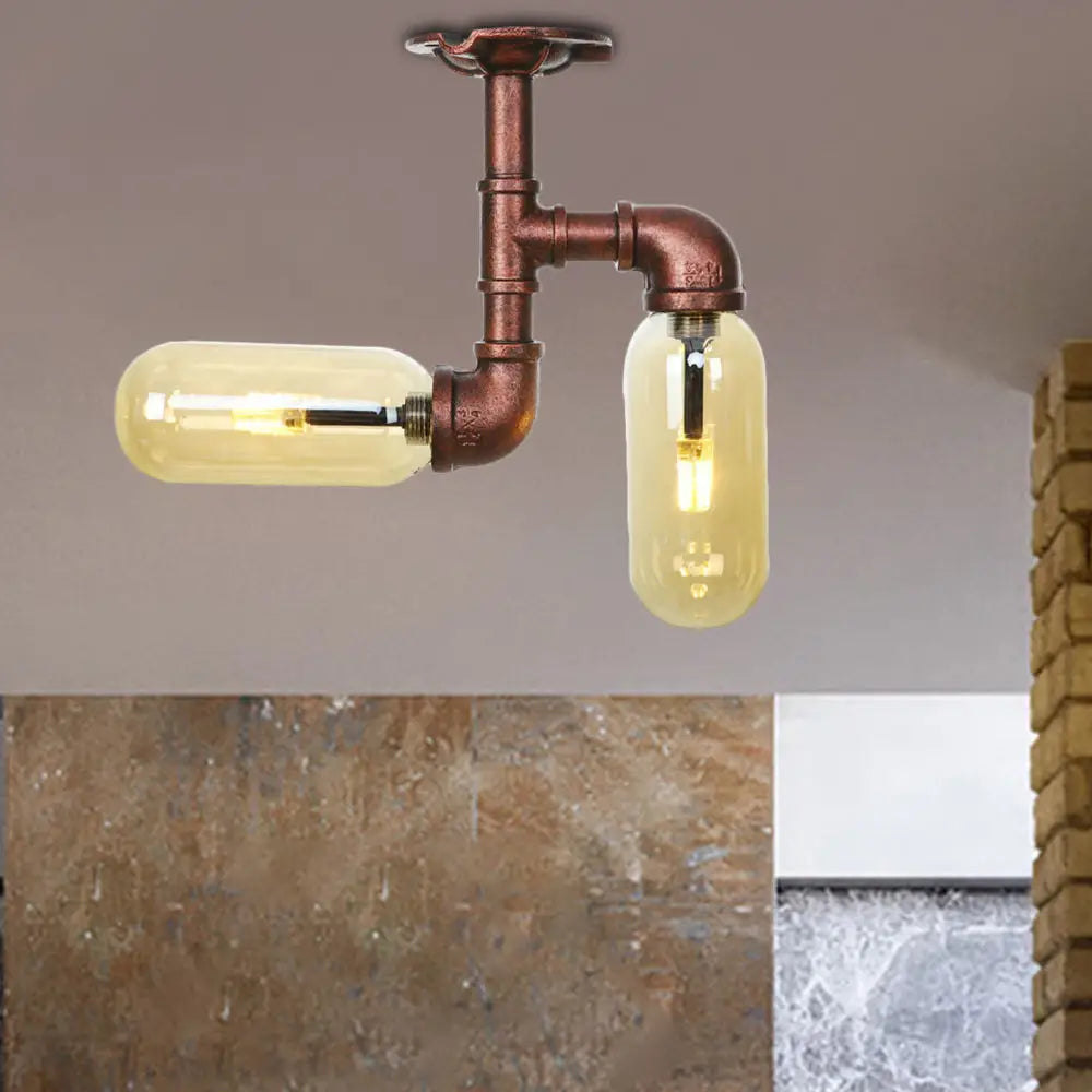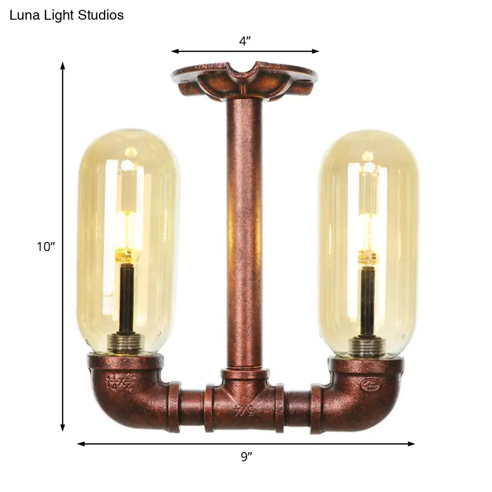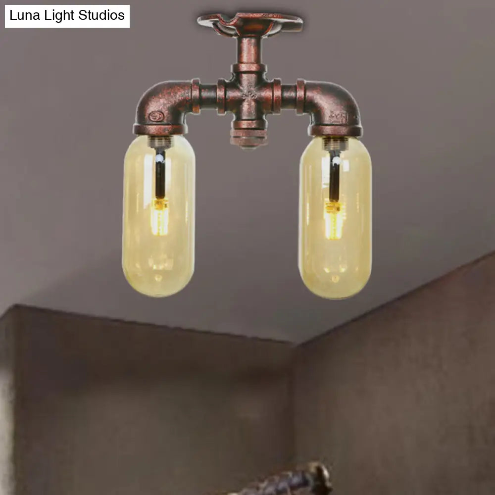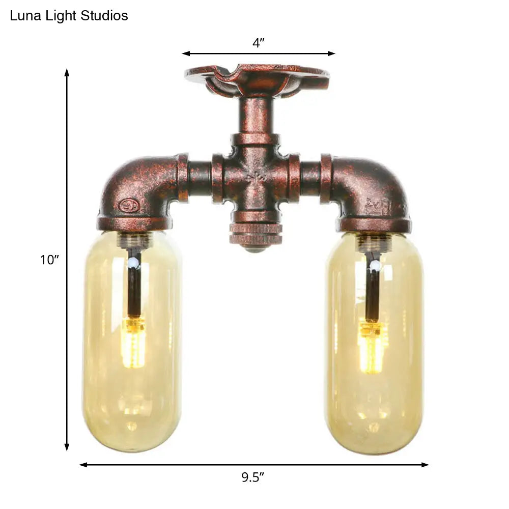 وحدة إضاءة صناعية شبه مستوية من ديكوربايتس™ لغرفة الطعام مصنوعة من زجاج العنبر، مصنوعة من النحاس المتآكل - غطاء كبسولة، مصباحان