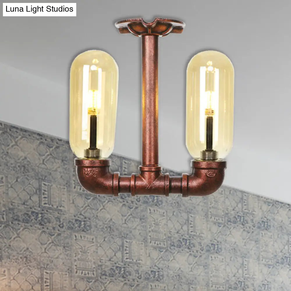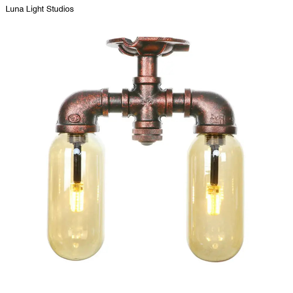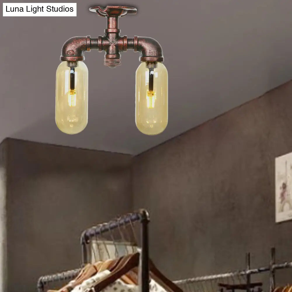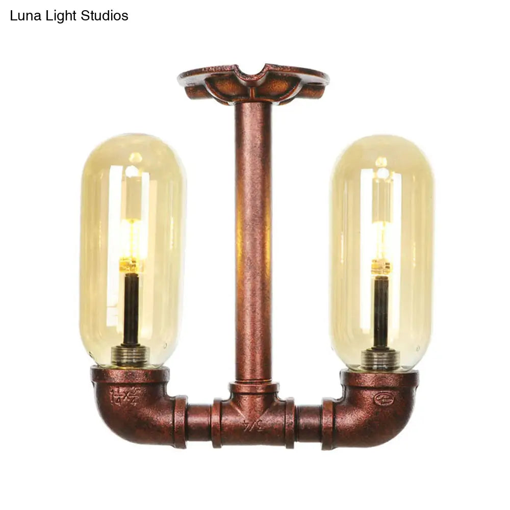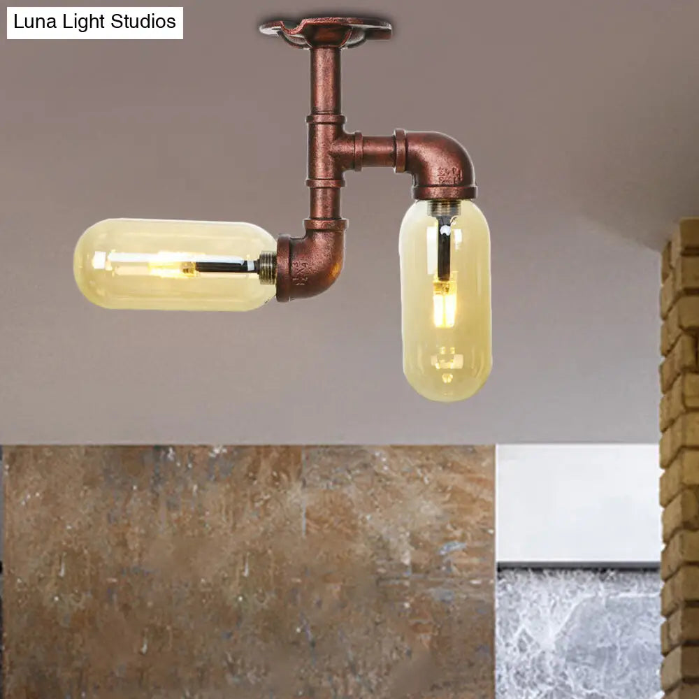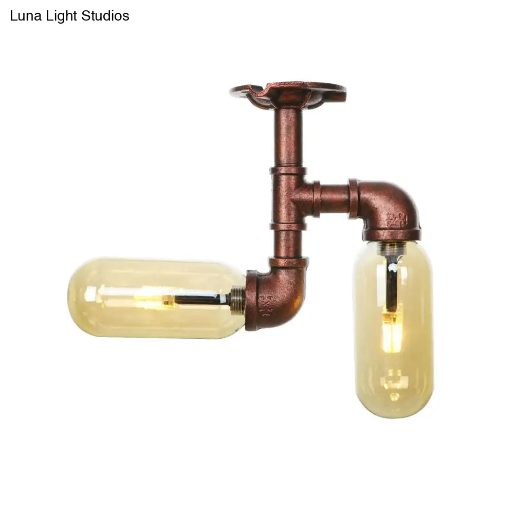 وحدة إضاءة صناعية شبه مستوية من ديكوربايتس™ لغرفة الطعام مصنوعة من زجاج العنبر، مصنوعة من النحاس المتآكل - غطاء كبسولة، مصباحان