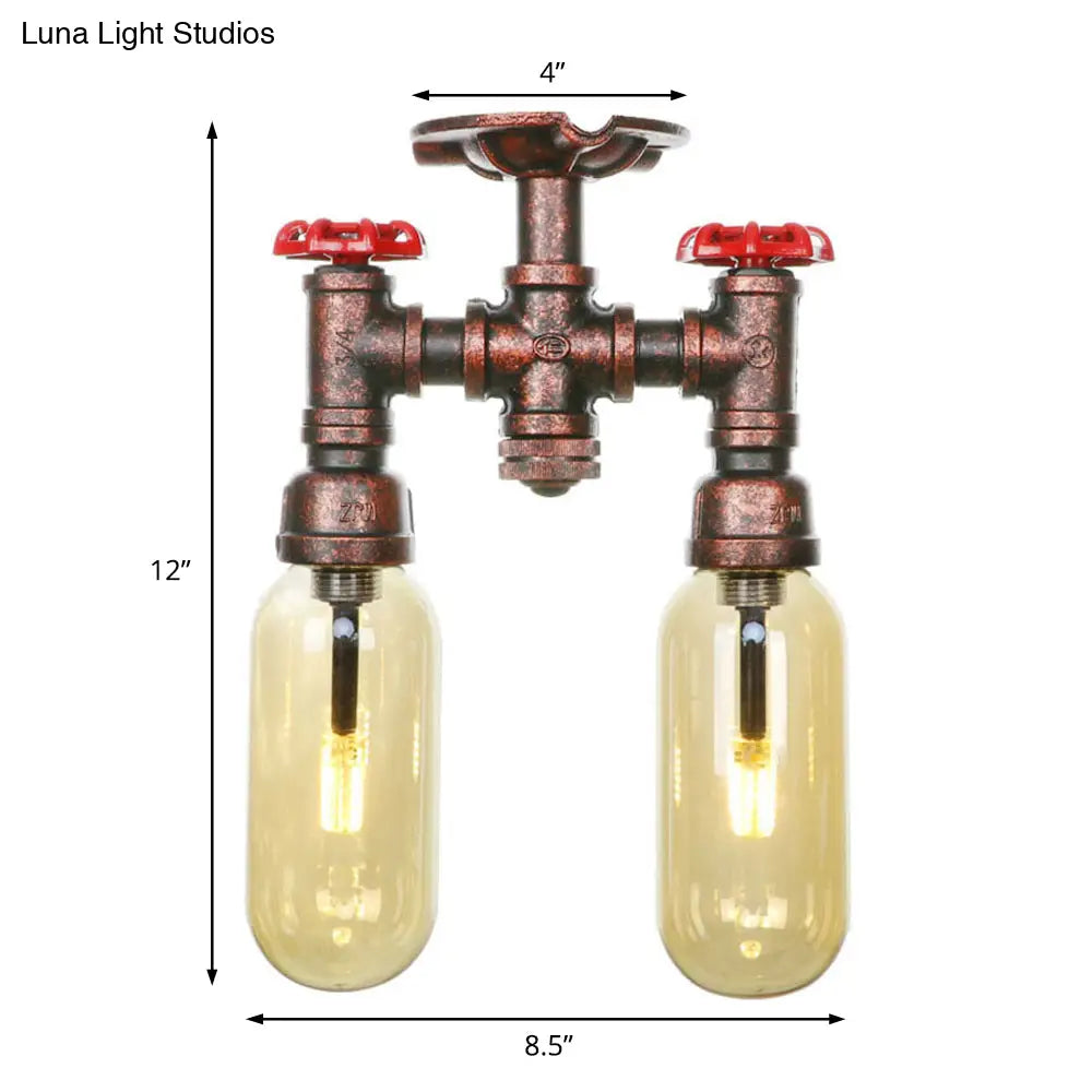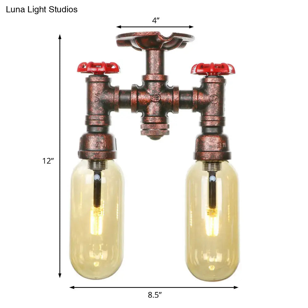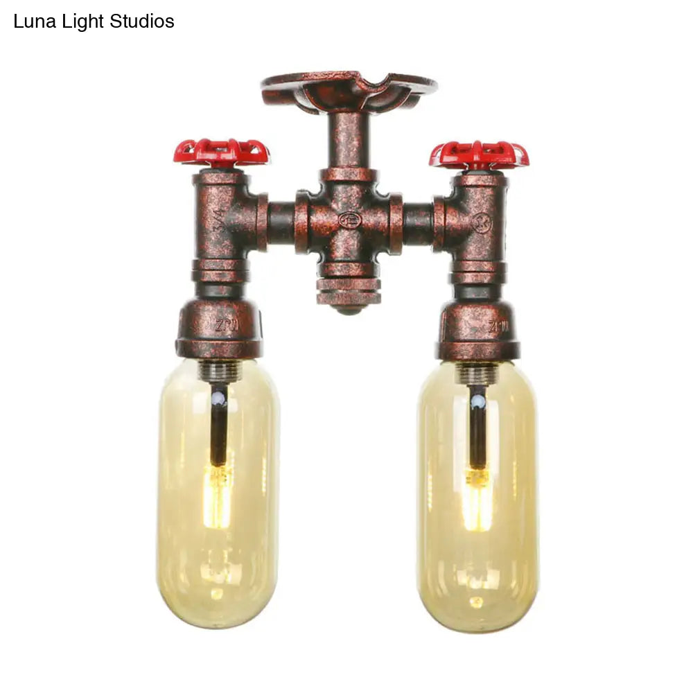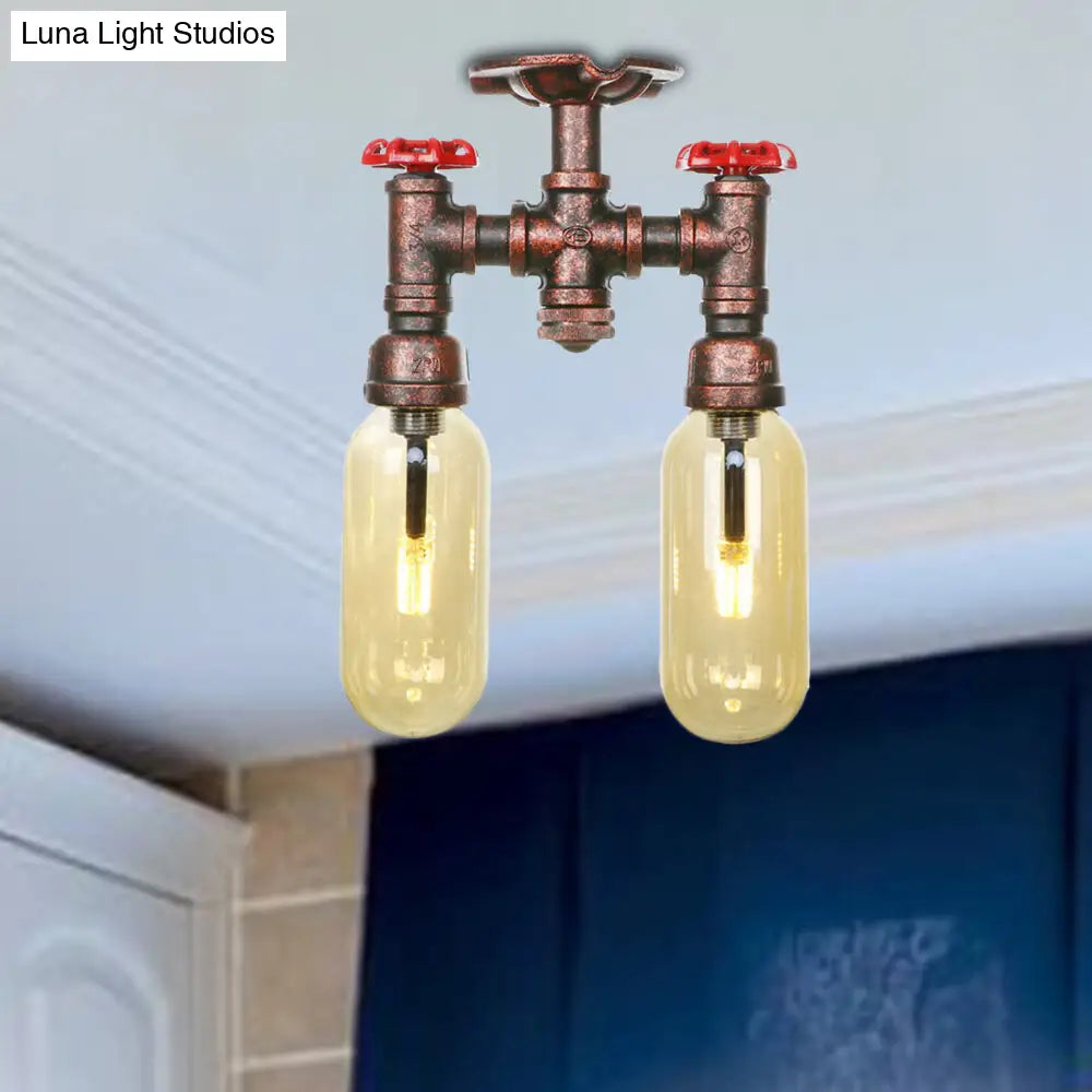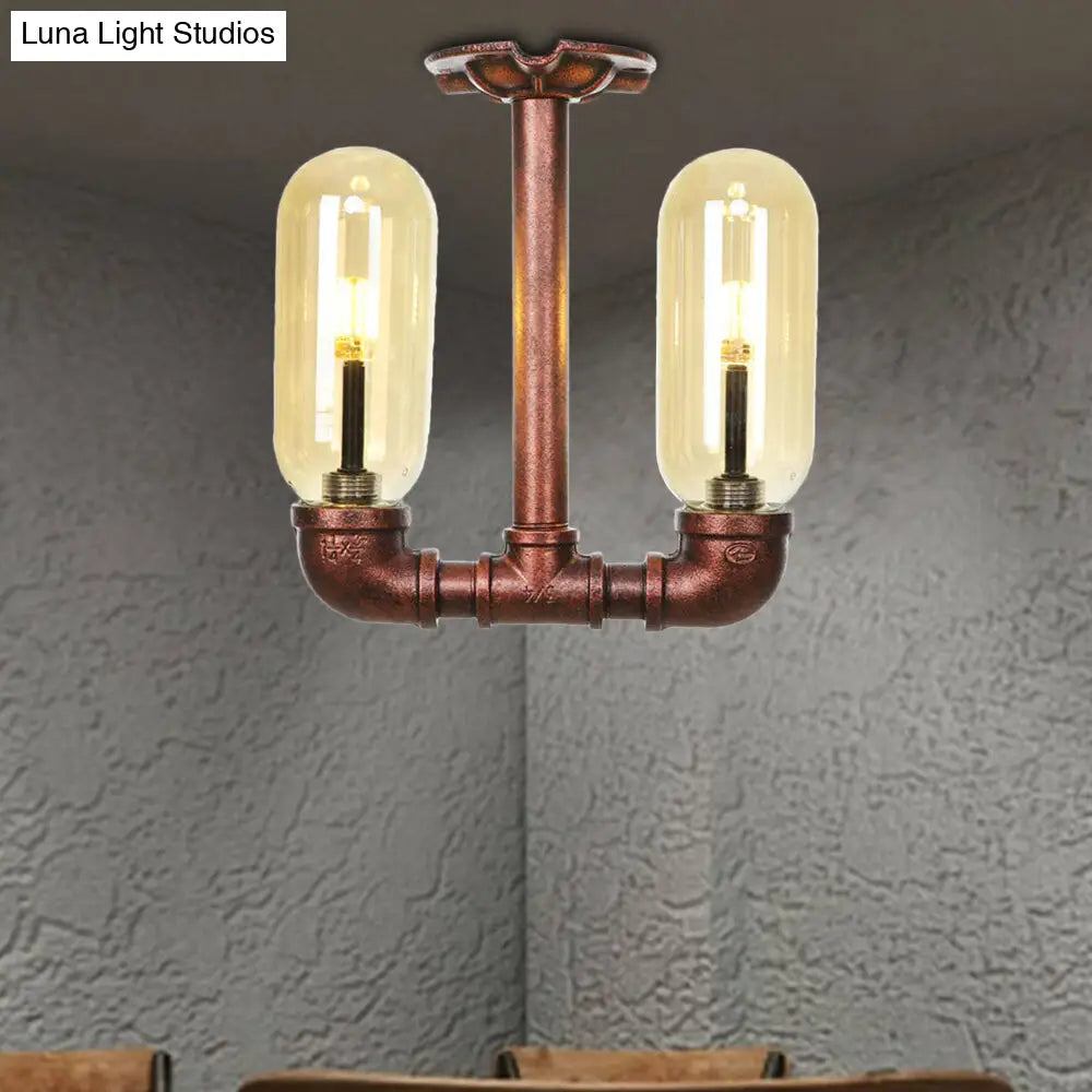 وحدة إضاءة صناعية شبه مستوية من ديكوربايتس™ لغرفة الطعام مصنوعة من زجاج العنبر، مصنوعة من النحاس المتآكل - غطاء كبسولة، مصباحان