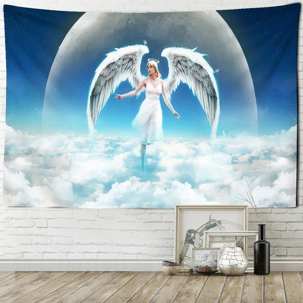 ديكور بايتس™ - نسيج ملائكي معلق على الحائط: سماء زرقاء وسحب بيضاء وهالة من الفن البوهيمي