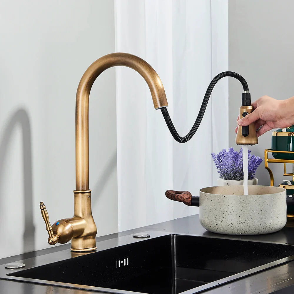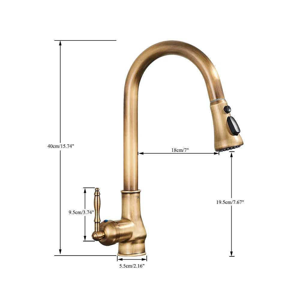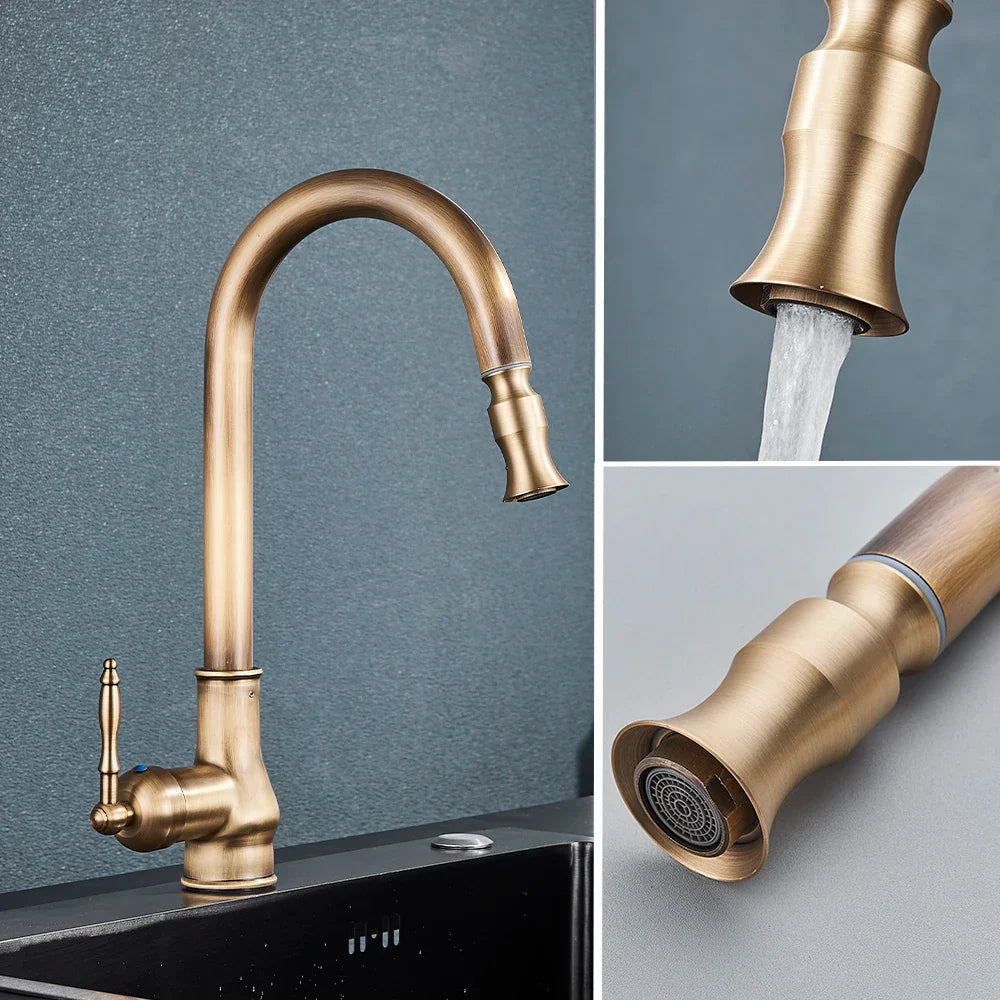 صنبور مطبخ من النحاس العتيق من DecorBites™ مع صنبور سحب لأسفل ومقبض واحد