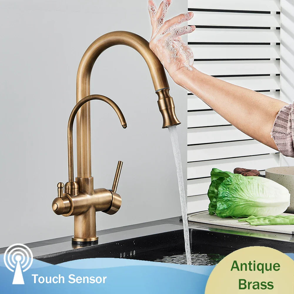 نقدم لك صنبور المطبخ النحاسي العتيق مع مستشعر اللمس وصنبور الرش الدوار، وهو مزيج مثالي بين الأناقة والوظيفة لمطبخك العصري.