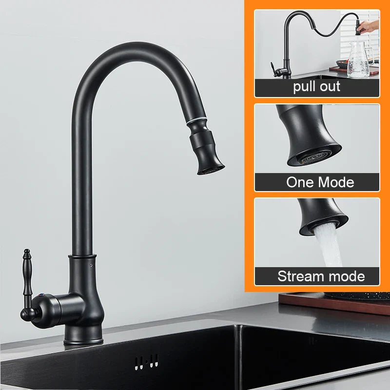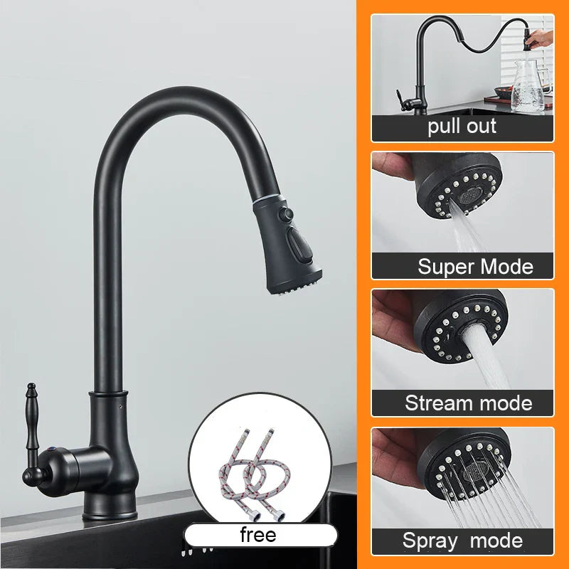 استمتع بسهولة استخدام صنبور السحب الدوار، الذي يُمكّنك من توجيه تدفق المياه بسهولة أينما تحتاج. سواءً كنت تغسل الأطباق أو تملأ الأواني، فإن هذا الصنبور متعدد الاستخدامات يُسهّل عليك مهام المطبخ.