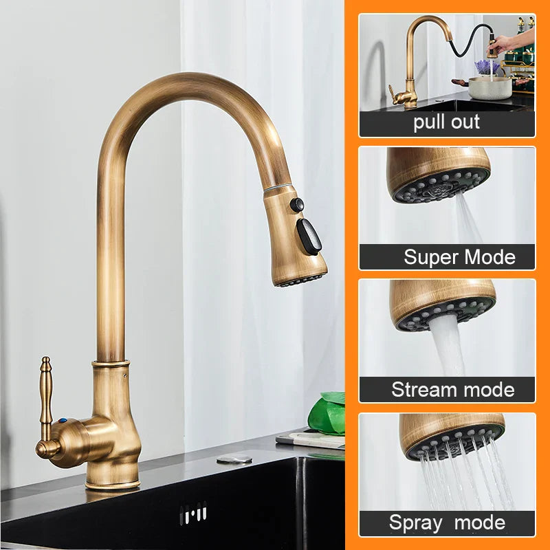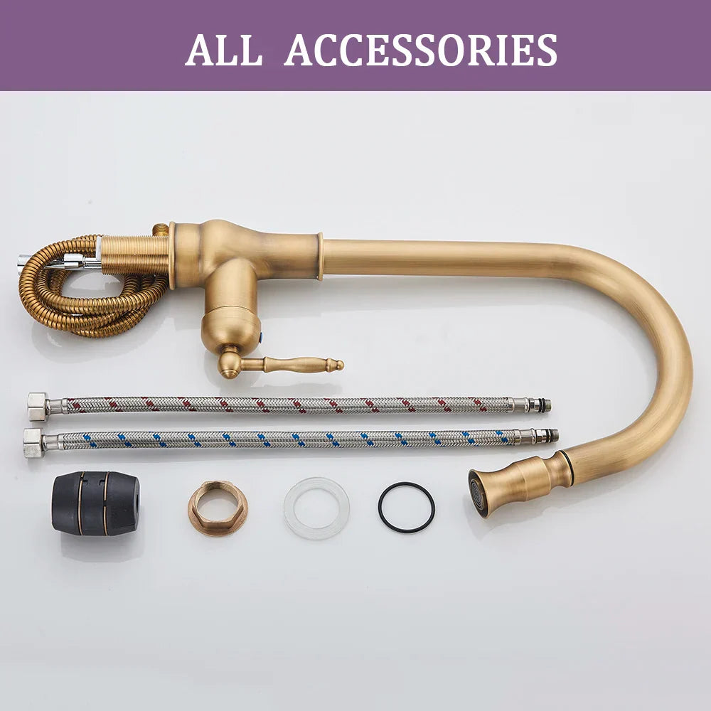 صنبور حوض المطبخ من نحاس عتيق من DecorBites™ مع فوهة دوارة قابلة للسحب للأسفل