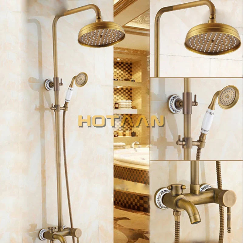 طقم حنفيات دش مطري عتيق من النحاس الأصفر مع دش يدوي، يأتي مزودًا بقضيب منزلق لمزيد من الراحة والتنوع. سواء كنت تفضل دشًا مطريًا منعشًا أو تدليكًا يدويًا، فإن طقم الحنفيات هذا يُلبي احتياجاتك.