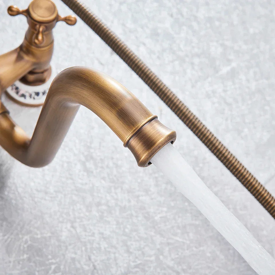 نقدم لكم خلاط الدش الجداري المصنوع من النحاس العتيق، مع فوهة دوارة بطول 30 سم، حيث يمتزج الأسلوب الكلاسيكي مع الأداء العصري. يتميز هذا الصنبور ذو المقبضين بتصميم خالد بلمسة نهائية نحاسية عتيقة خلابة، مما يضفي لمسة من الأناقة على ديكور أي حمام.